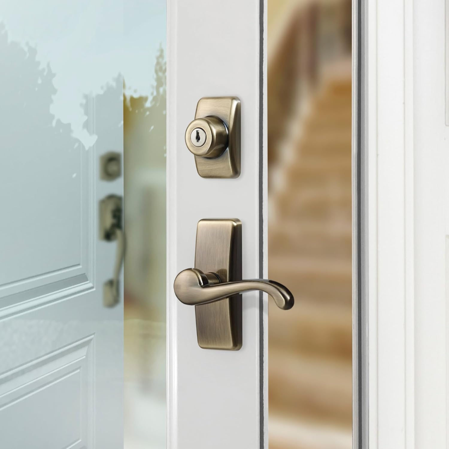 Product Description This deluxe storm door hardware set includes an elegant lever handle, interior latch, and keyed deadbolt It is compatible with most pre-installed handles, and compliments a wide range of dcor styles. The elegant and easy to operate handle replaces the basic push button handle that may already be on your screen door. The interior latch features an easy opening push movement. The matching keyed deadlock lock provides additional security, so you can keep your main door open and enjoy the light and fresh air while still feel safe (this is not a high security lock, but a secondary level of security). The long-lasting finish will provide an added touch of class to any storm door. Installation This set includes everything needed for an easy installation and will fit doors from 1" to 2-1/8" thick. Installation should take about 30 minutes. When replacing an existing handle, the screw posts for the handle must be 1-3/4" apart. For new installations, three additional holes are required to be drilled through the door for the screws and spindle. The lock can be installed above or below the handle, depending on your preference. The spindle for the deadlock may be cut for your particular installation. A tape measure, drill and screw driver will be required. A center punch to mark the holes is helpful. Before drilling, ensure that the inside latch and lock do not interfere with the operation of your main door handle. If they do, raise or lower the storm door hardware. Ideal Security has been supplying quality hardware to door manufacturers for 60 years. Please explore our other door and window hardware products for your home. From the Manufacturer The deluxe lever storm door handle and keyed locking set compliments a wide range of decor styles. This elegant and easy to operate handle can replace a push button handle that may be on your screen door. The screw posts must be 1-3/4 in. apart. The interior latch features an easy opening push movement which does not lock. The included keyed lock complements the appearance of the handle and provides additional security. Keep your main door open and enjoy the light that comes in through a storm door, and still feel secure. This is not a high security lock, but a secondary level of security. Install above or below the handle. Three additional holes are required to be drilled through the door for the screws and spindle for a new installation. This set includes everything needed for an installation and will fit doors from 1 in. to 2-1/8 in. thick. The spindle for the deadlock may be cut for your custom installation. Installation will take about 30 minutes. A tape measure, drill and screw driver may be required. A center punch to mark the holes is helpful. Before drilling, ensure that the inside latch and lock do not interfere with the operation of your main door handle. If it does, raise or lower the storm door hardware. This handle and key lock set will provide an added touch of class to any storm door. All 4 components are the same color or finish. Ideal Security has been supplying quality hardware to door manufacturers for over 50 years.