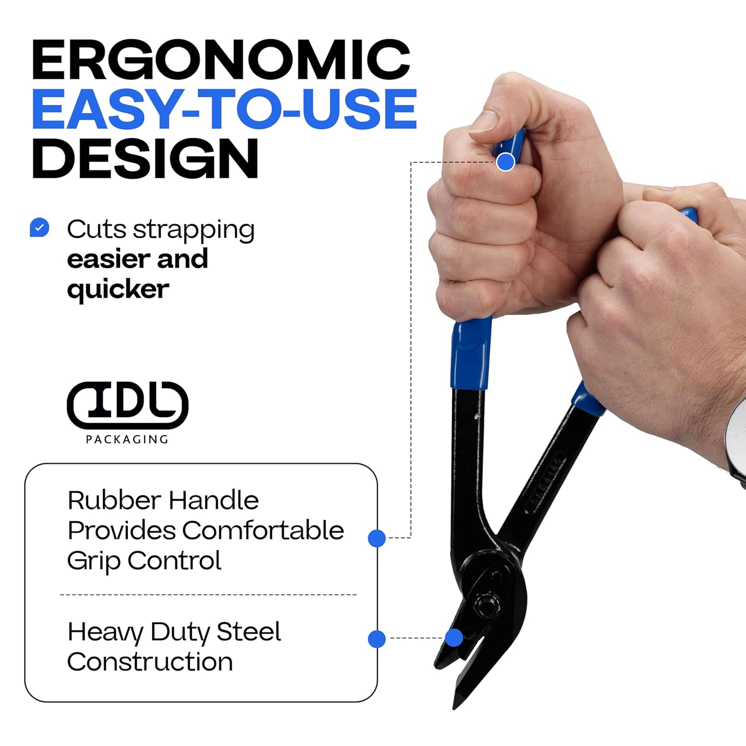 The universal H-230 strapping cutter efficiently cuts from 3/8 inch to 1 1/4 inch steel, polyester (PET), and polypropylene (PP) banding up to 0.044 inch thickness. An easy-grip handle provides optimal performance and comfort. Simple manual operation allows cutting packaging strapping with minimal effort. Ergonomic design, longer handles makes the strap cutter a superior option on the market. Good for commercial, packaging, shipping, and other related applications. We offer a large selection of strapping tools at our IDL Packaging Amazon Brand Store. Please choose the one that suits you best.