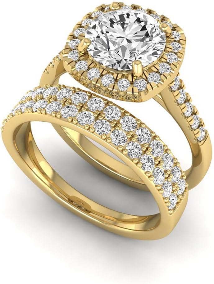 IGI Certified 3.15 Carat Round Lab Grown Diamond (2 Ct, D, VS1) 14K Gold Halo Engagement Wedding Ring Set For Womens Specifications: Diamond Material : Lab Grown CVD Diamond Diamond Shape: Round Cut Total Diamond Weight: 3.15 CTTW (Approx.) Center Diamond Weight: 2.00 Carat Center Diamond Color : D Center Diamond Clarity: VS1 Side Diamond Weight: 1.15 Carat (Approx.) Side Diamond Color: E-F Side Diamond Clarity: VVS-VS Stamp: Our All Products Stamped According to metal Purity. MONEY BACK100% satisfaction and money back. If there are any problems with the purchase, please feel free to contact us, we will help to fix the problem. Maintenance InstructionA. Keep it dry and avoid wearing it when bathing, doing housework and swimming. B. Perfume is also corrosive to jewelry. Wear your perfume before putting on the piece. C. Grease and sweat on hands will caused corrosion. Be careful.