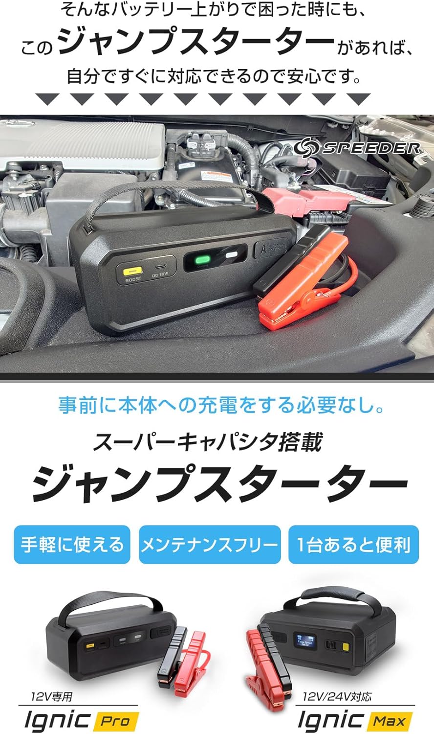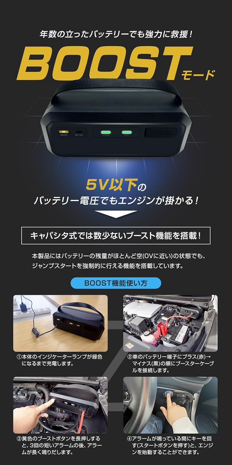 Capacitor type jump starter that does not require any prior charging; Ultra compact size: 7.9 x 3.2 x 3.6 inches (20 x 8.1 x 9.2 cm). No Li-ion battery included Easy to operate; Various charging methods
