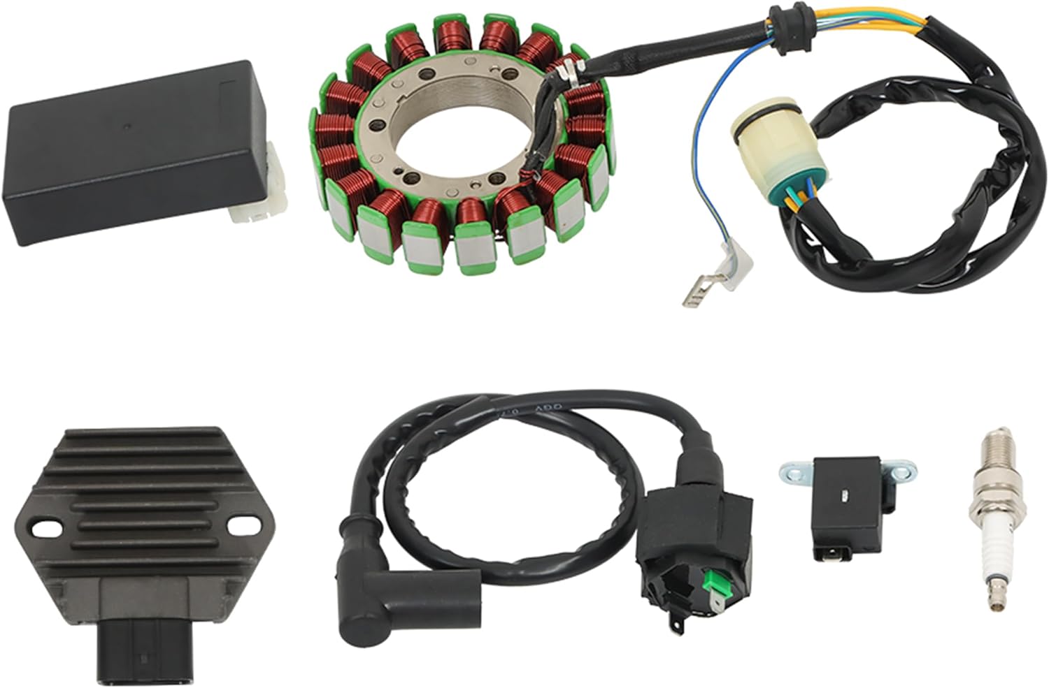 Fitment:Replacement for Honda Foreman 450 TRX450ES 4x4 ES 1998-2001Replacement for Honda Foreman 450 TRX450S 4x4 S 1998-2001Replacement for Part Number:30410-HN0-A01 (cdi)31120-HM7-014 (stator)30510-HM7-003 (ignition coil)30700-KY4-900 (Plug cap)Note:Please check carefully if this part is compatible with your vehicle before placing your order