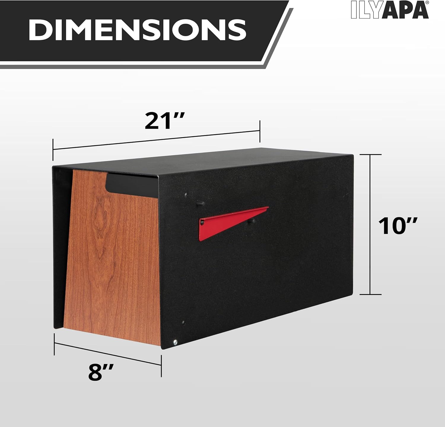 Patent Pending All Weather Protection: This outdoor metal large mailbox will protect your mail from the elements for years to come. Powder Coated Steel, All Weather Resistant Mailbox Spacious Modern Mid Century Design: Allows for the delivery of not just your ordinary mail, but also small packages. Dimensions: The metal mailbox measures 21""long, 8""wide, and 10""tall. Universal hole pattern for multiple mounting applications, Includes 4 mounting bolts, 4 nuts, and 4 washers. Quality Construction: Features corrosion resistant powder coating and welded steel construction, the heavy duty mailbox also has a strong magnetic door that hold tightly shut so your mail is kept safe and dry. Durable, Weather-Resistant Construction: Built from premium heavy-duty steel, this mailbox post mount is engineered to withstand the elements. Its rust- and corrosion-resistant finish ensures long-lasting performance, making it an ideal solution for mailbox posts for outside that need to stand the test of time. Compatible with Most Mailboxes: Designed for universal fit, this modern mailbox with post includes two universal mailbox mounting bracket plates, allowing for seamless installation with a wide range of standard and decorative mailboxes.