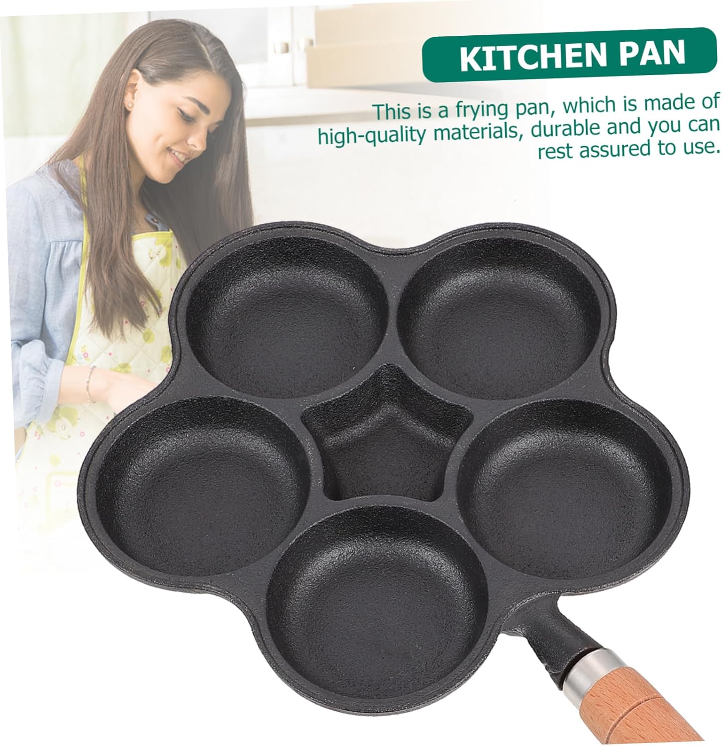 Package Include 1 x pan Characteristics - Color: Black Cooking Pot. - Material: Iron, wooden Egg Frying Pans. - Size: About 41.50X24.00X2.00cm/16.31X9.43X0.79inch Fried Egg Pan. - 5-hole compartments for easy use, practical for kitchen use Non-stick Omelette Pot. - Round hole position to uniform and beautiful finished products Kitchen Accessory. - You can to frying 5 eggs or burgers at the same time Five-hole Mold. - Anti-hot handle, safe and practical for using Breakfast Skillet Pan. - Cooking is quicker and easier, requiring only a few simple steps Five-hole Egg Pan.Goods DescriptionPancake Pot The non-slip comfort grip is designed for manipulating ease during cooking.Cooking Pot This five hole nonstick frying pan can make five kinds of delicious dishes, fried steak, pancake, Bacon and so on.Non-stick Omelette Pot Make breakfast easier and quicker