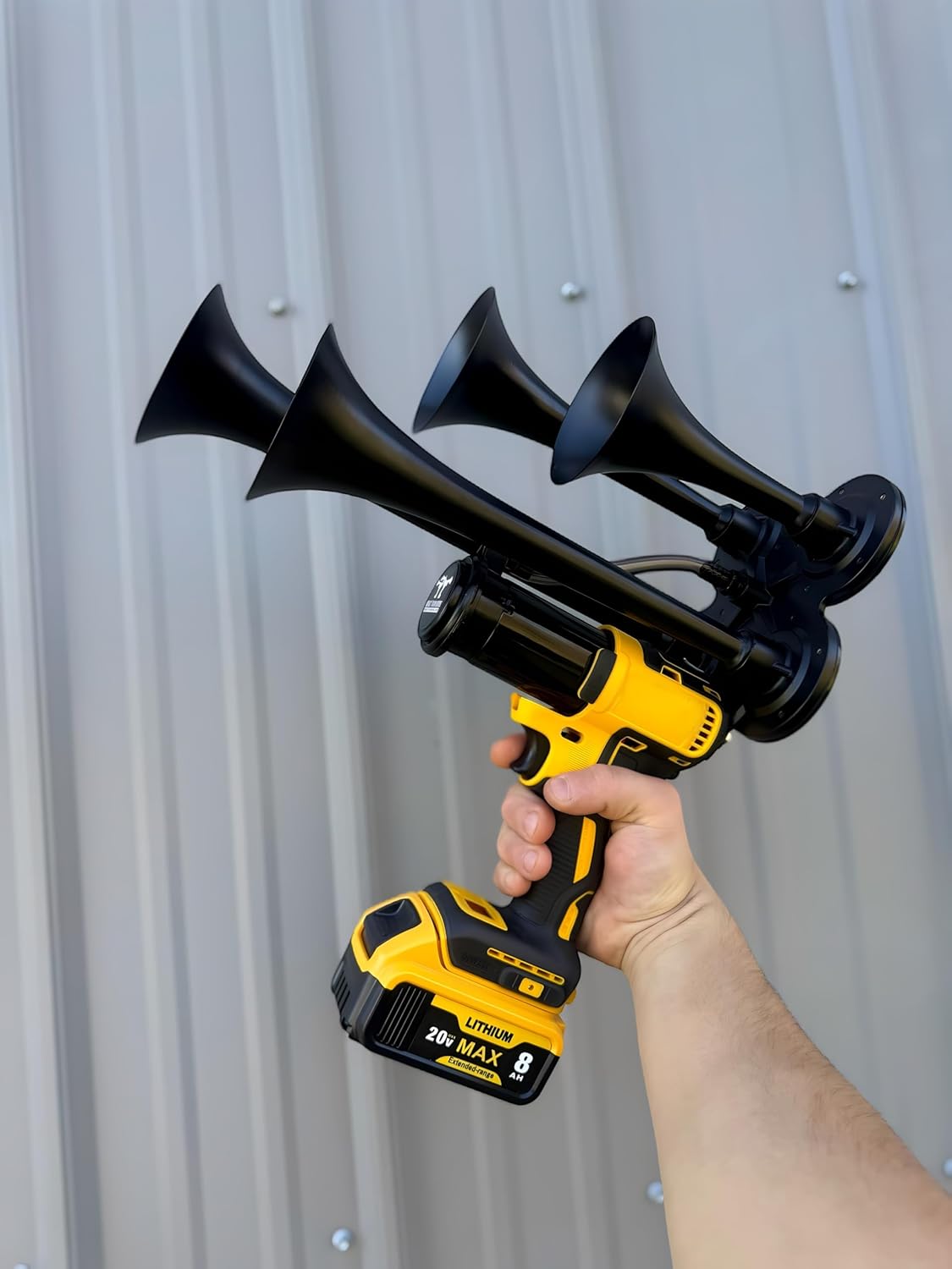 Unleash the ultimate portable air horn with the Impact Train Horn —perfectly engineered for those who need instant, powerful alerts. Featuring a high-performance, this horn hits a staggering 140 dB, loud enough to be heard from over a mile away. Its cordless design uses standard DW 20v drill batteries (sold separately), making setup as simple as sliding in a battery—no wiring required .
