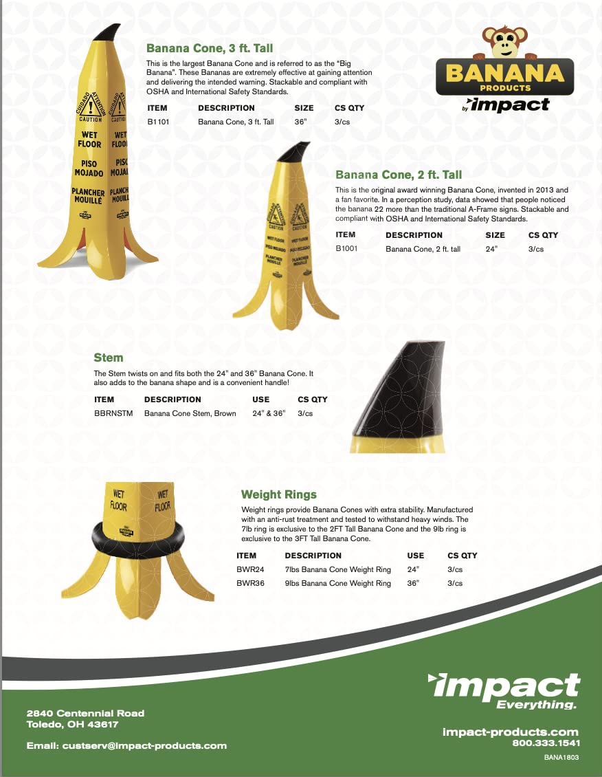 BE NOTICED! The average cost per slip-and-fall accident is $22,000, totaling around $70 billion each year. Businesses can reduce slip-and fall accidents by promoting safety and using proper equipment. In a comprehensive study of Banana Products wet floor cones vs traditional wet floor signs, 88% of participants noticed the “Banana Cone”, versus 7% noticing the “Floor Sign”. This study concludes that pre-existing knowledge of the banana peel slip reference is the root cause for “Banana Cone” to significantly outperform all other products in tests for safety perception. (Sold in Packs of 3)