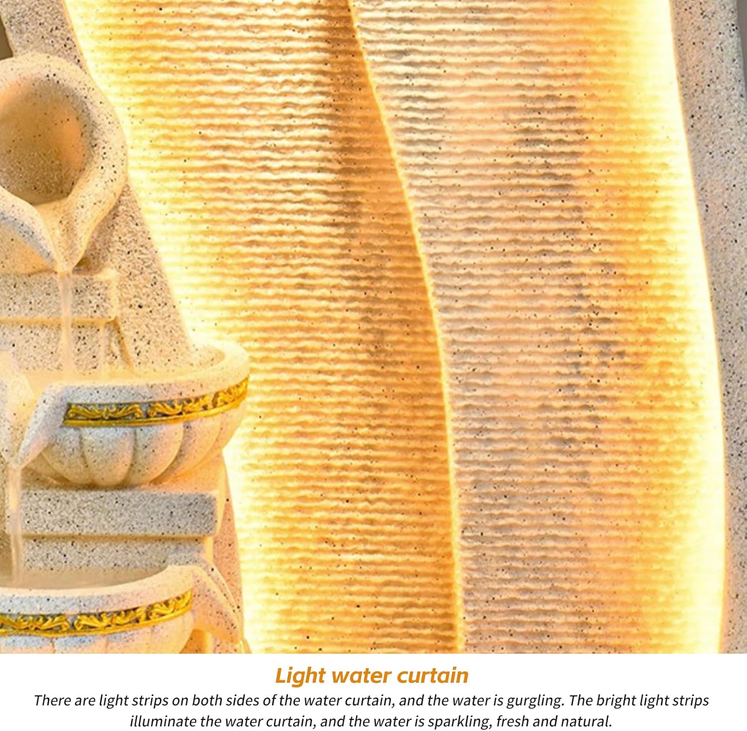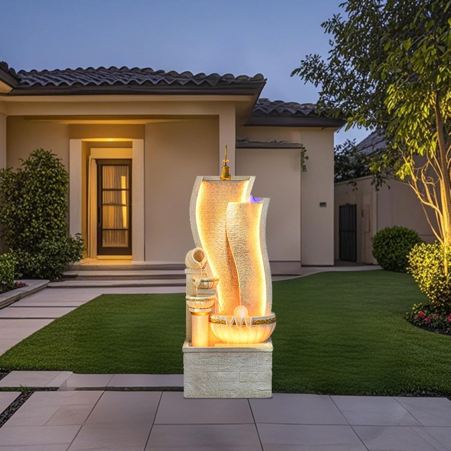 Bring peace and elegance to your home or garden with this sculptural resin water fountain. Designed with a flowing wave structure and integrated lighting, this lightweight water feature combines the calming sound of running water with a glowing mist effect. The layered bowl cascade and spinning crystal ball add motion and charm, while the cobblestone base provides natural texture. Ideal for indoor spaces like foyers, spas, and lounges, or as a serene centerpiece outdoors. Made from durable resin for easier relocation and reduced shipping weight, without compromising visual impact.
