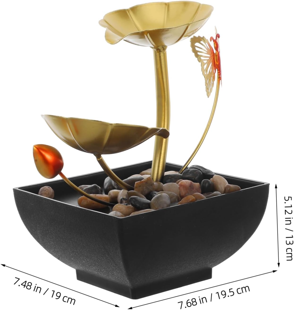 Package Include 1 fountain, 1 pump with USB cable, 1 stone Features -Artistic design: the golden lotus leaf and waterfall feature of this fountain provide a unique and eye catching decorative element centerpiece -Color:Golden party -Size:19.50X19.00X13.00cm/7.66X7.47X5.11in use -Material:ABS, stone, iron fountain -Versatile use: suitable for various indoor settings such as offices, living rooms, and bedrooms, adding to the ambiance tabletop - build: crafted from resin and iron, this fountain is designed for use and durability feature -Humidity enhancement:: the mist from the fountain increases air humidity, contributing to better air relaxation -Versatile decoration: suitable for various room settings, this fountain adds a decorative touch to your home, office, or any indoor space waterfallGoods Informationindoor tabletop fountain The fountain's compact size makes it easy to place on any table or desk, adding a touch of elegance to your indoor space.table centerpiece decoration The realistic landscape design and soothing water flow create a peaceful and calming atmosphere.lotus leaf desktop fountain Enhance your home decor with this exquisite leaf tabletop fountain