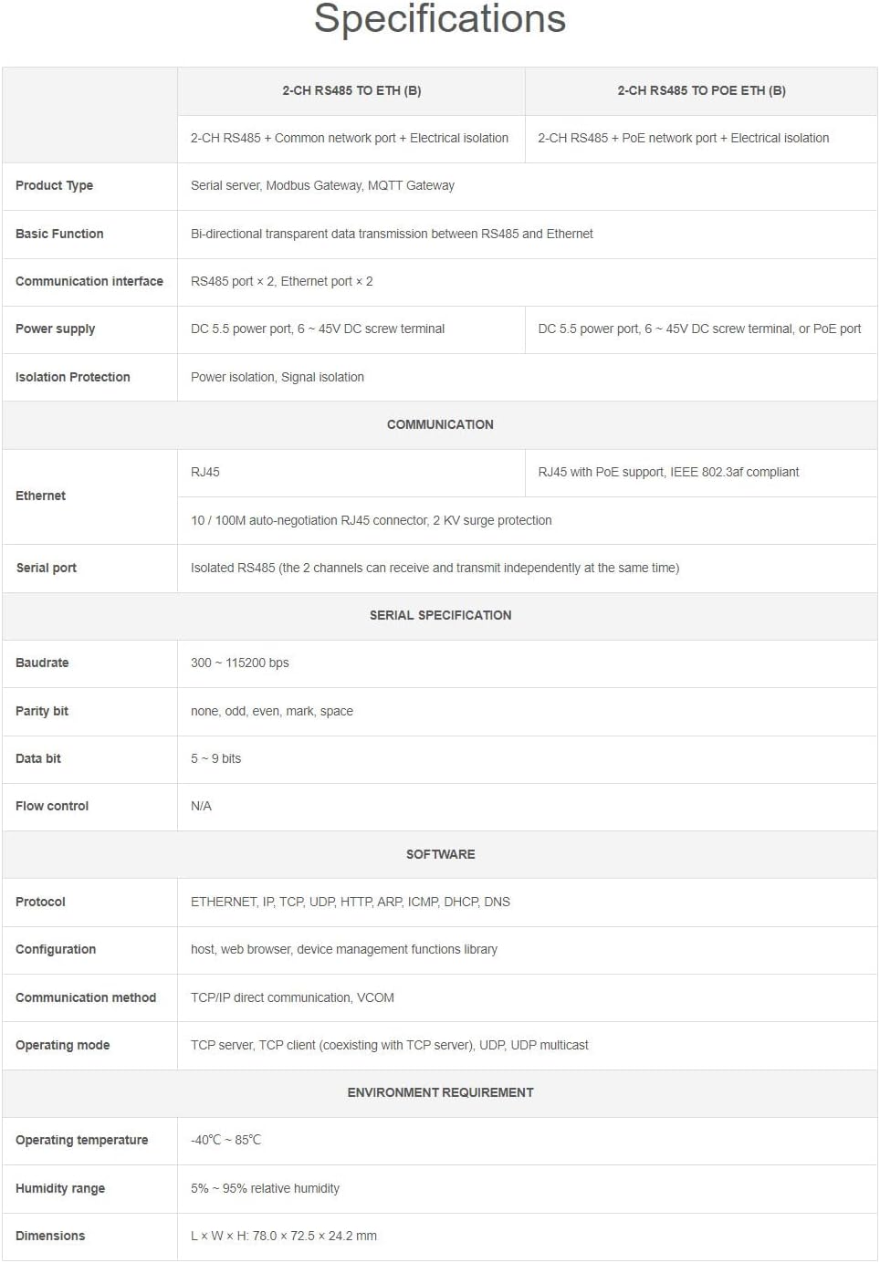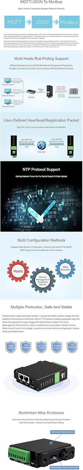Overview A 2-ch RS485 device data acquisitor / IoT gateway designed for the industrial environment. Dual RS485 can work simultaneously without interfering with each other. It combines multi functions in one, including serial server, Modbus gateway, MQTT gateway, RS485 to JSON, and network switch. The module features dual RS485 and dual Ethernet ports (PoE function optional), uses a DC port (outer diameter: 5.5mm, inner diameter: 2.1mm) and screw terminal for power input. The case with rail-mount support, is small in size, easy to install, and cost-effective. It is suitable for applications like data acquisition, IoT gateway, safety & security IoT, and intelligent instrument monitoring... Package include 1. 2-CH RS485 TO POE ETH (B) x1