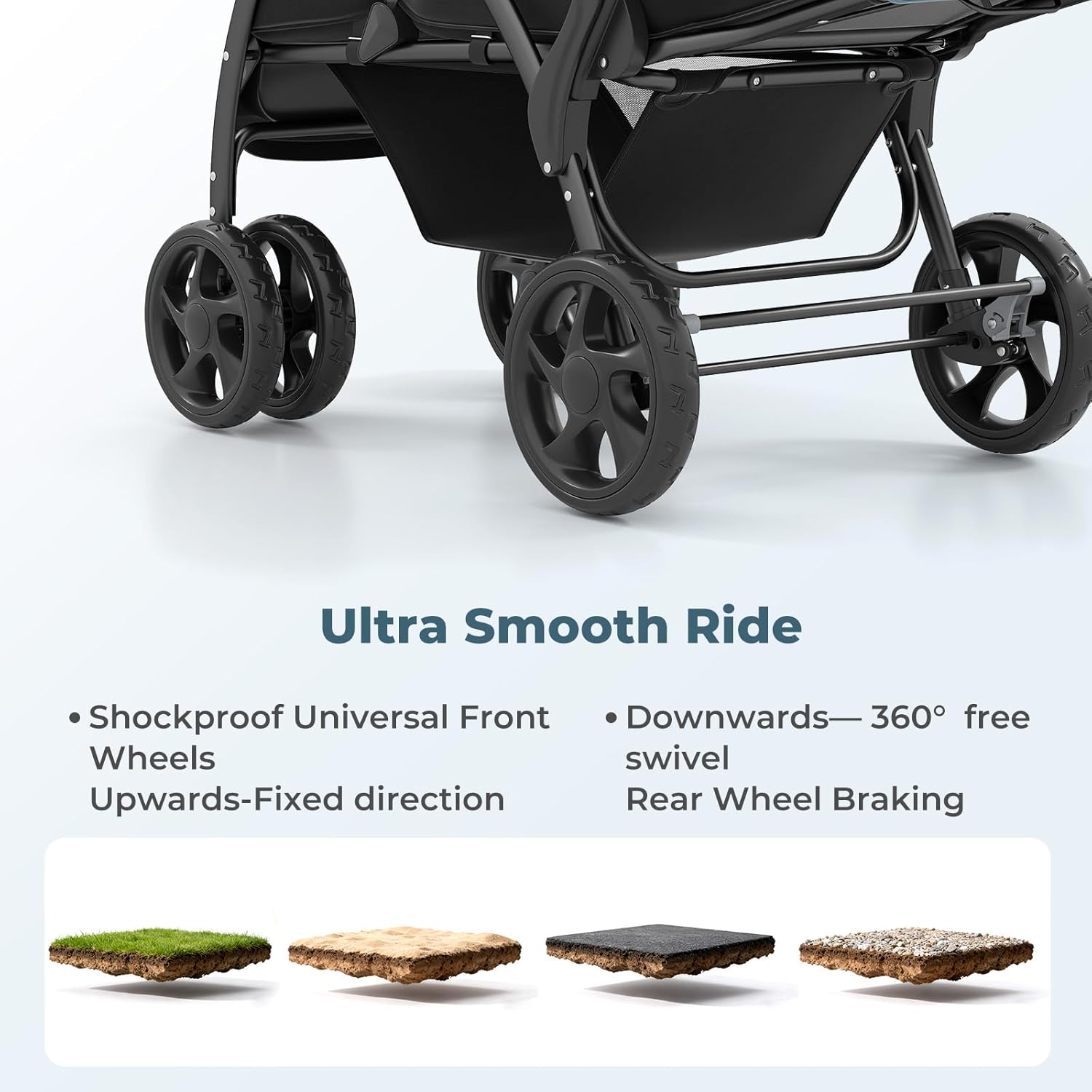 • Smooth Ride, Safety First: Glide through any terrain with ease thanks to the shock-absorbing Lockable universal front wheels and rear wheels with a one-step brake system. Enjoy a stable and smooth ride while five-point safety harnesses provides extra security for children.