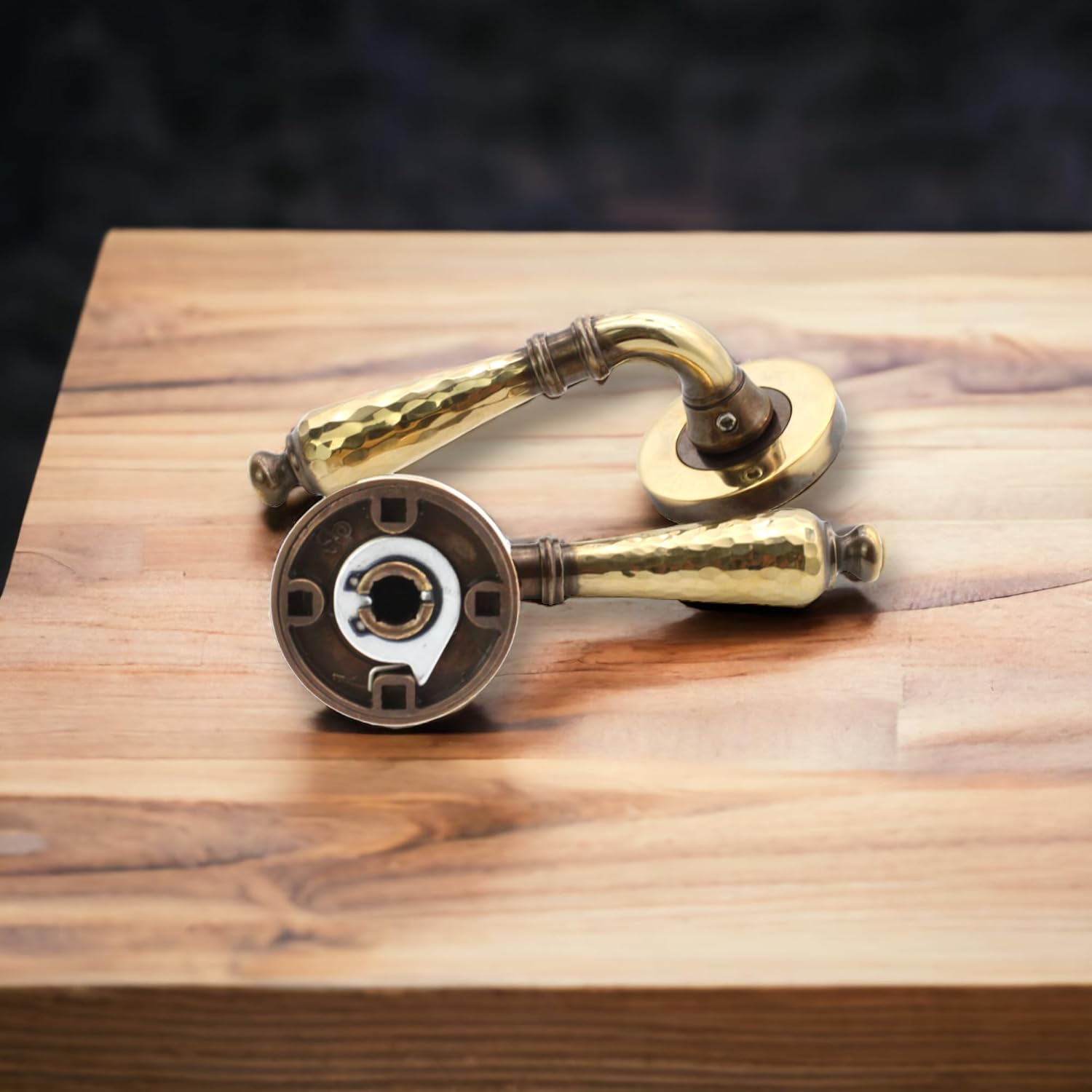 Aged Brass Hammered Lever on Rose Door Handles Set This solid brass hammered door handle on a concealed sprung rose featuring a unique hammered texture and elegant lever design makes this handle a statement piece that enhances the look and functionality of your doors. They are so comfortable and easy to use as they can be used on their own, for regular passage doors, or can be combined with locking or bathroom escutcheons if security/privacy is required. This lever door handle with a unique hammered texture adds a visual interest to the handle and a touch of rustic charm to your door. Manufactured from high quality solid brass material using traditional casting methods for strength and durability and is finished with a protective coating that prevents rust and corrosion for a long-life use. It comes with heavy duty spring that enables a smooth movement, allows the handle to return to the horizontal position after use. They can be used with a standard tubular latch for a normal door opening and closing, with a mortice lock or euro profile sash lock. Designed to suit a variety of door types including wood, metal, and uPVC. They can be used in both residential and commercial settings and also on both left and right-handed doors. The beautiful unlacquered aged brass finish grows more aged with time as it is hand finished naturally. This natural ageing feature adds character and individuality to each product which gives an authentic antique and vintage look to it that enhances aesthetics of your home decor. Supplied in pairs for both sides of the door with complete fixings for easy assembly. Pack Includes: 1 x Pair of door handles Sleeve bolts 7mm Spindle Allen key Screws Specifications: Material: Solid Brass Finish: Aged Brass Lever length: 112mm Projection: 40mm Rose thickness: 8mm Rose diameter: 51mm Spindle size: 100mm x 7mm