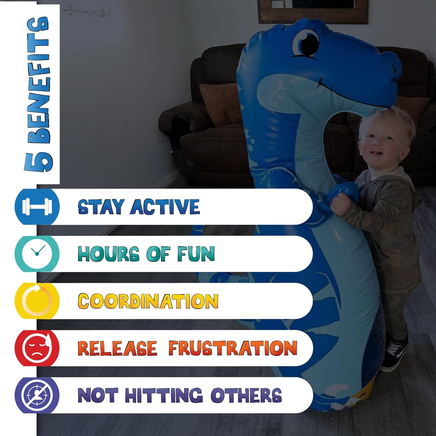 Dinosaur Punching Bag Our kids inflatable punching bag is a great kids toy to have! -Increase your child's physical activity and improve their health. -Have the option to play indoors and outdoors. -Help manage emotions (Release stress and frustration while increasing mood) -Celebrate accomplishments, enjoy the holidays, and have fun at birthday parties! Our boxing bag is also an amazing children's sports toy that can be used for sparring, karate, MMA, kickboxing, taekwondo, and more!!! Minimum Age recommended 3+