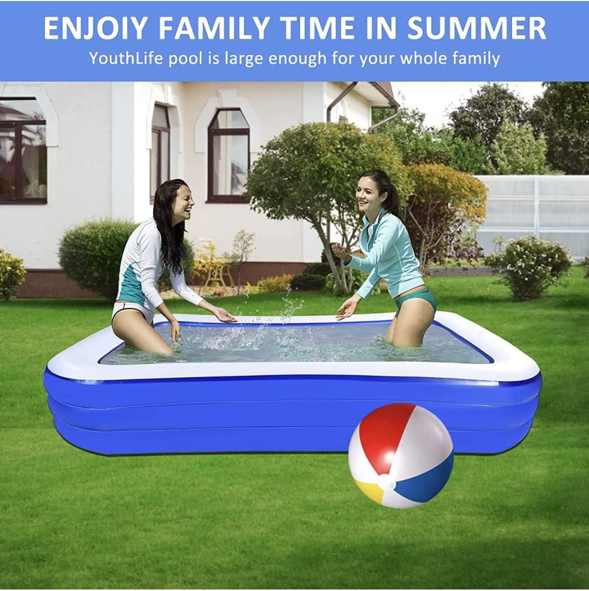 ☼YouthLife Inflatable Swimming Pool, Enjoy Summertime Splashing FUN! ☼Enjoy the water party with your family and friends in the cool water with our blow up pool. ☼Large and Spacious The size of the kiddie pool is 103x72x22 inches, which is enough to accommodate 2 adults and 3-5 children in the pool ☼Quick and Easy to Inflate & Deflate Inflate in 3-4 minutes by an electric pump (not included) - This inflatable swimming pool equipped with efficient valves that make it both easy to set up and deflate ☼Durable & Safe The kids pool made with 0.4mm thickness lead-free PVC material, The thicken bottom greatly reduce the risk of punctures and ensuring a long service life. ☼What’s in the Box 1 * Inflatable Pool 1 * Swimming Ring(May be different from the picture) 1 * Inflatable Beach Ball 1 * Repair Patch ☼Warm Tips 1. Children must be supervised by adults while they play in the bow up pool. 2. Check for sharp objects before placing the inflatable on the ground. 3. Do not fill the swimming pool more than 2/3 full with water. 4. Avoid prolonged exposure the inflatable pool in the sun for longer life of the pool. ☼Dimension Size: 103" X 72" X 22" Material: Premium PVC Water Capacity: 340 gallons Fit for Age: 3+