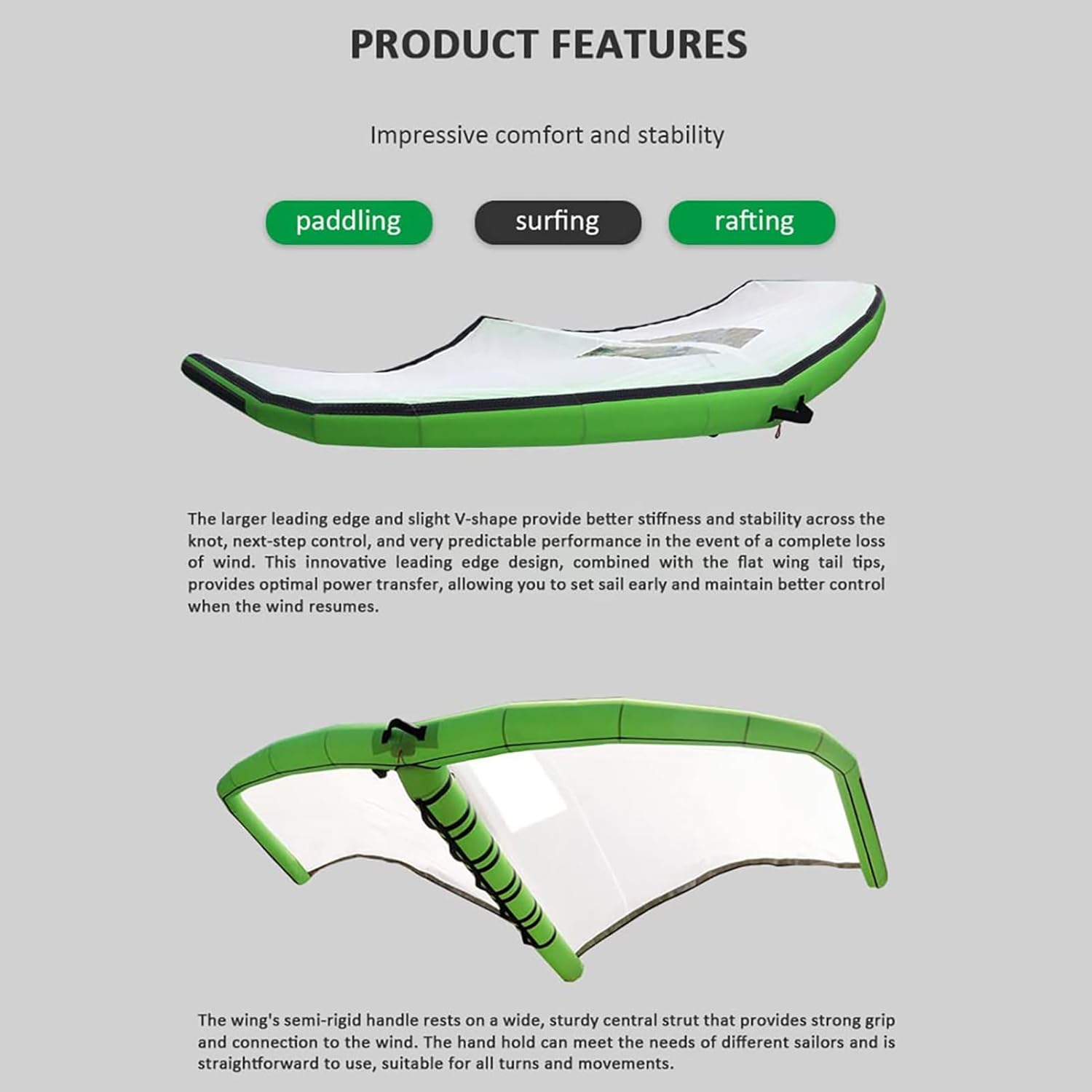 Light weight, easy to store and transport;Aerodynamics and good balance, easy to maneuver;Dual independent inflation/deflation system with rapid air flow valve;Open the window design, look more open to the marine businessTwo independent airbags are more safe and reliable. Even if one airbag is damaged and leaks, the other airbag can make you float on the water. We are serious about safety.The package includes:1*Surf kite hydrofoil1*Storage bag1*Pump1* Patch Pack1*safety ropeSpecification:Name: Handheld Kitesurfing KiteMaterial: NylonArea: 5 square metersSize: 348X134CMWeight: 5.6kg (with window)Suitable for beginnersNotes:1.Actual color may differ slightly from the picture due to the different brightness of the monitor and the color of the light.2.Due to manual measurement, please allow 0-2cm error. Thanks for your understanding.