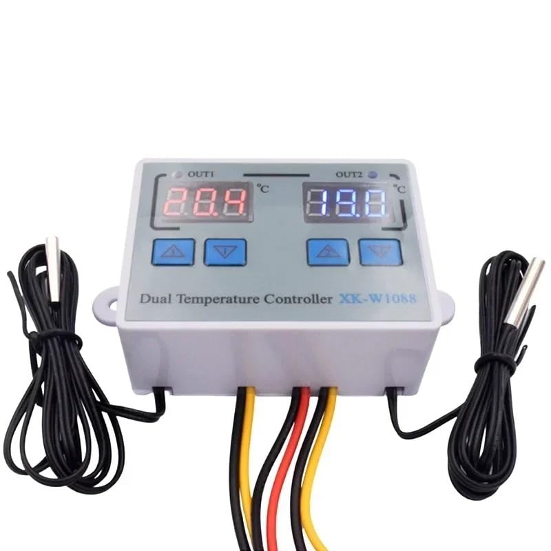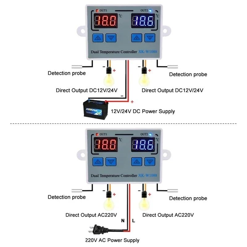 Features:Heating or cooling controlRed and blue dual led displayIndependent Dual-way temperature controllerTemperature display resolution 0.1Directly power outputSupport high(low) temperature alarm and support for power loss (the parameters of the sudden power failure are still valid)Application range is like home temperature control, farm, various cold storage, greenhouse, aquarium, etc.Specifications:Display Type: DigitalShell Material: ABS + PCBTemperature Sensor: NTC 10KSenor Length: 1mTemperature Measuring Range: -55 ° C ~ 120 ° CResolution: 0.1 ° CAccuracy: ±1° CPower Supply: 110-220VAC 50/60Hz, 12V DC , 24V DC(Please choose power supply when ordering)Relay Contact Capacity: Two Relay Max 10A Output Type: Direct OutputSize: 72*56*31mm