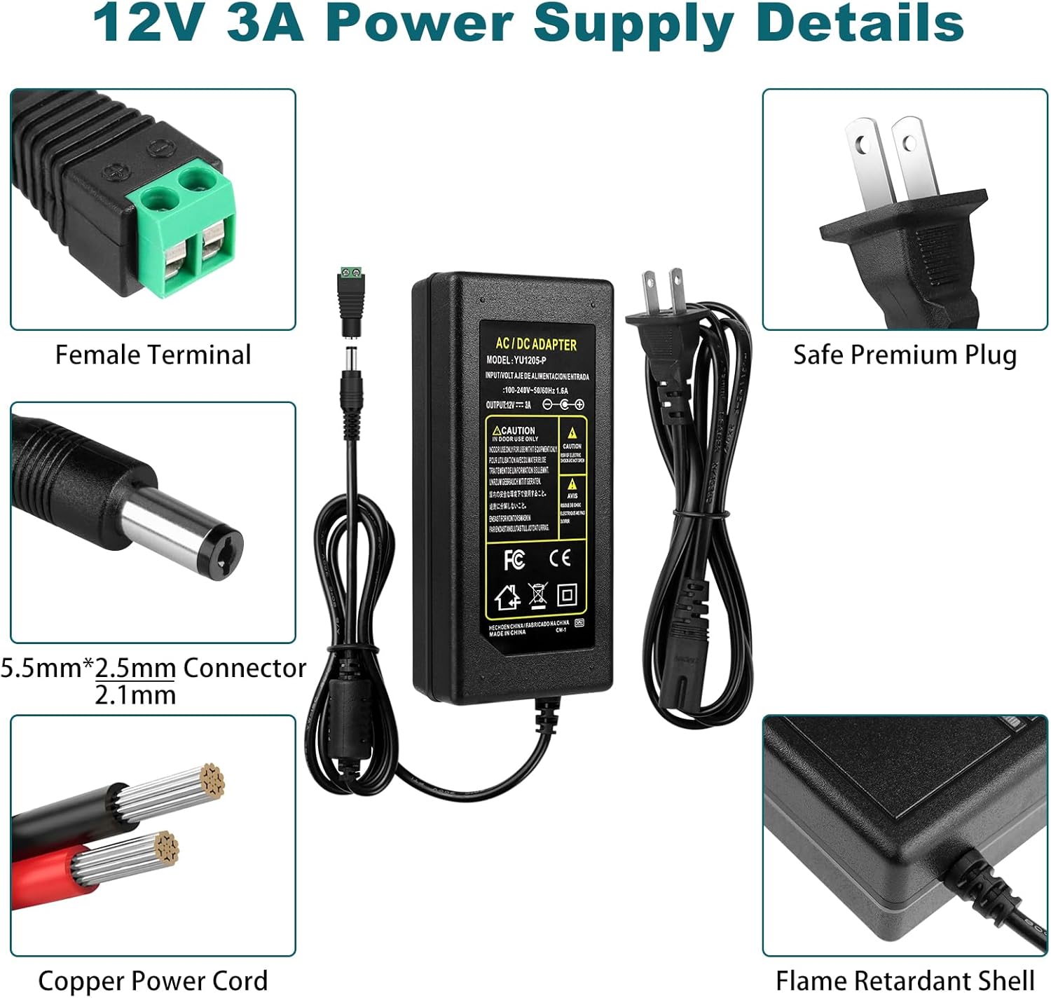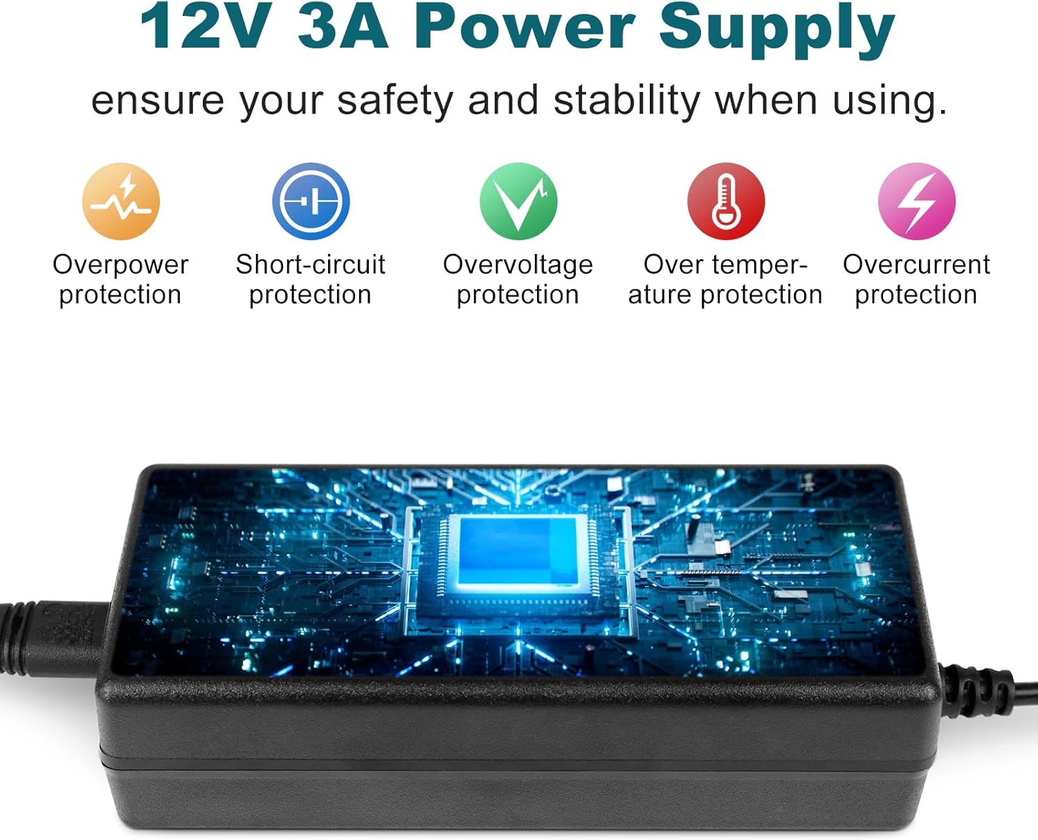 | BuiltIn Media | 5x 12V 3A 36W power supply with 3.9ft cord, 5.5/2.1 DC female barrel connector to screw adapter |