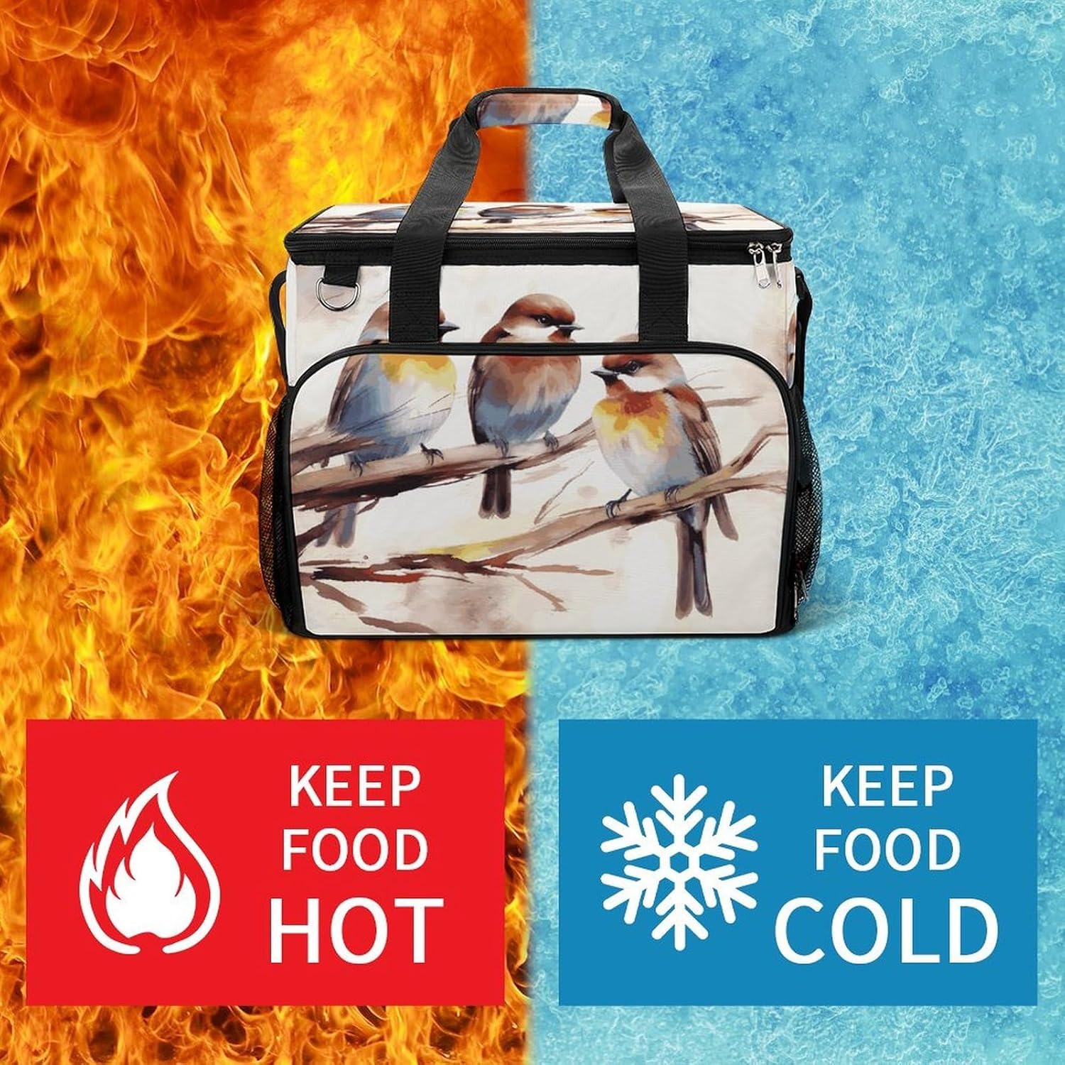 Take Your Meals Anywhere with Birds Resting on Tree Branch Grocery BagsFood Container Carrier Oxford Fabric Picnic Bag Heat Retaining Food Bag Camping Cooler BBQ Accessories Cute Picnic Bag with Pockets Insulated Food Bag for Work Insulated Lunch Tote Bag Camping BagTemperature Control That WorksThe upgraded aluminum foil lining creates an effective thermal barrier. Your drinks stay refreshingly cold, and your hot dishes maintain their warmth for hours. No more lukewarm meals during outdoor outings.Thoughtful Storage DesignTwo side mesh pockets - Perfect for water bottles or umbrellasFront zippered pocket - Keeps keys, phone, or condiments organizedInternal mesh pocket - Stores utensils, napkins, and small essentialsMain compartment - Spacious enough for food containers and snacksBuilt for Daily AdventuresConstructed from high-density oxford fabric with reinforced stitching at stress points. The double zippers are sturdy and smooth-operating. Reinforced handles let you carry heavy loads with confidence.Carry Your WayHandles for quick grabbingStands upright for easy packing and accessPerfect For:Picnics in the parkBeach days and pool partiesCamping and hiking tripsOutdoor concerts and festivalsDaily work lunchesGym and fitness classesRoad trips and travelGrocery shoppingSpecifications:Dimensions: 15.4 x 11.8 x 11.8 inchesMaterial: High-density Oxford fabricLining: Aluminum foil (insulated)Closure: Sturdy double zippersPockets: 2 side mesh, 1 front zipper, 1 internal meshCare: Hand wash or machine wash, do not bleachNote: Food containers and utensils shown in images are not included.