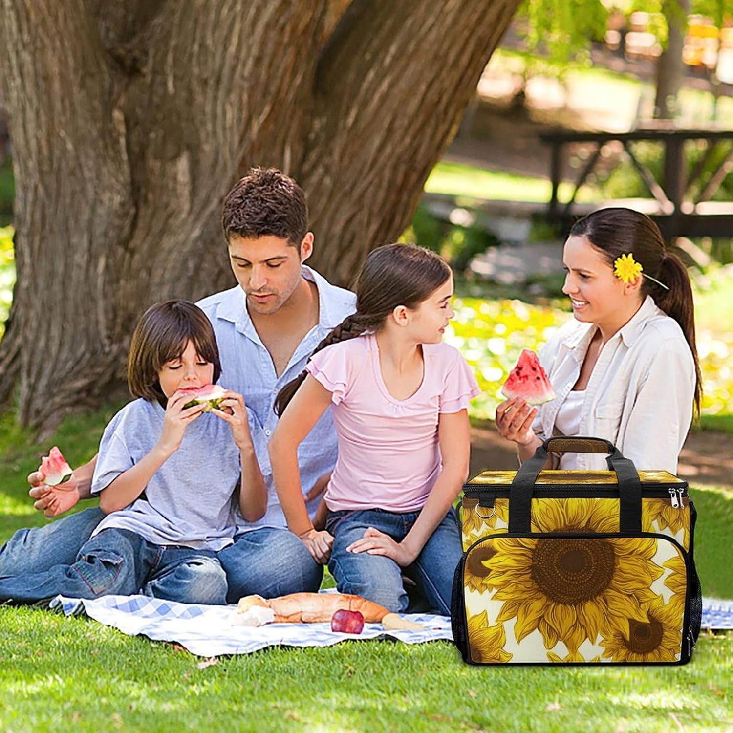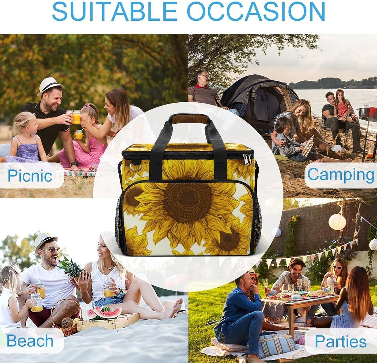 Take Your Meals Anywhere with Sunflower Grocery BagsFood Container Carrier Oxford Fabric Picnic Bag Heat Retaining Food Bag Camping Cooler BBQ Accessories Cute Picnic Bag with Pockets Insulated Food Bag for Work Insulated Lunch Tote Bag Camping BagTemperature Control That WorksThe upgraded aluminum foil lining creates an effective thermal barrier. Your drinks stay refreshingly cold, and your hot dishes maintain their warmth for hours. No more lukewarm meals during outdoor outings.Thoughtful Storage DesignTwo side mesh pockets - Perfect for water bottles or umbrellasFront zippered pocket - Keeps keys, phone, or condiments organizedInternal mesh pocket - Stores utensils, napkins, and small essentialsMain compartment - Spacious enough for food containers and snacksBuilt for Daily AdventuresConstructed from high-density oxford fabric with reinforced stitching at stress points. The double zippers are sturdy and smooth-operating. Reinforced handles let you carry heavy loads with confidence.Carry Your WayHandles for quick grabbingStands upright for easy packing and accessPerfect For:Picnics in the parkBeach days and pool partiesCamping and hiking tripsOutdoor concerts and festivalsDaily work lunchesGym and fitness classesRoad trips and travelGrocery shoppingSpecifications:Dimensions: 15.4 x 11.8 x 11.8 inchesMaterial: High-density Oxford fabricLining: Aluminum foil (insulated)Closure: Sturdy double zippersPockets: 2 side mesh, 1 front zipper, 1 internal meshCare: Hand wash or machine wash, do not bleachNote: Food containers and utensils shown in images are not included.