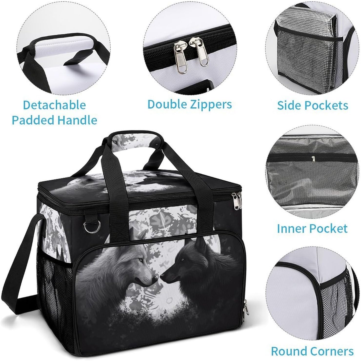 Take Your Meals Anywhere with Wolves Love Under The Moon Wild Animal Grocery BagsFood Container Carrier Oxford Fabric Picnic Bag Heat Retaining Food Bag Camping Cooler BBQ Accessories Cute Picnic Bag with Pockets Insulated Food Bag for Work Insulated Lunch Tote Bag Camping BagTemperature Control That WorksThe upgraded aluminum foil lining creates an effective thermal barrier. Your drinks stay refreshingly cold, and your hot dishes maintain their warmth for hours. No more lukewarm meals during outdoor outings.Thoughtful Storage DesignTwo side mesh pockets - Perfect for water bottles or umbrellasFront zippered pocket - Keeps keys, phone, or condiments organizedInternal mesh pocket - Stores utensils, napkins, and small essentialsMain compartment - Spacious enough for food containers and snacksBuilt for Daily AdventuresConstructed from high-density oxford fabric with reinforced stitching at stress points. The double zippers are sturdy and smooth-operating. Reinforced handles let you carry heavy loads with confidence.Carry Your WayHandles for quick grabbingStands upright for easy packing and accessPerfect For:Picnics in the parkBeach days and pool partiesCamping and hiking tripsOutdoor concerts and festivalsDaily work lunchesGym and fitness classesRoad trips and travelGrocery shoppingSpecifications:Dimensions: 15.4 x 11.8 x 11.8 inchesMaterial: High-density Oxford fabricLining: Aluminum foil (insulated)Closure: Sturdy double zippersPockets: 2 side mesh, 1 front zipper, 1 internal meshCare: Hand wash or machine wash, do not bleachNote: Food containers and utensils shown in images are not included.