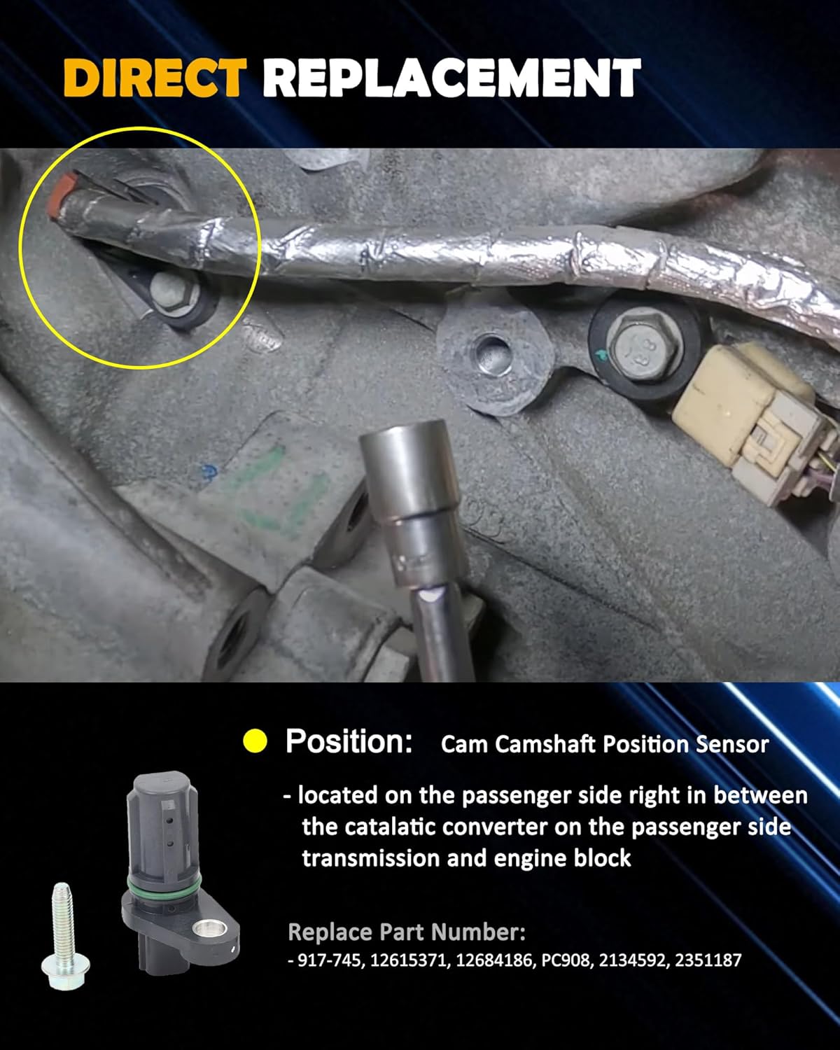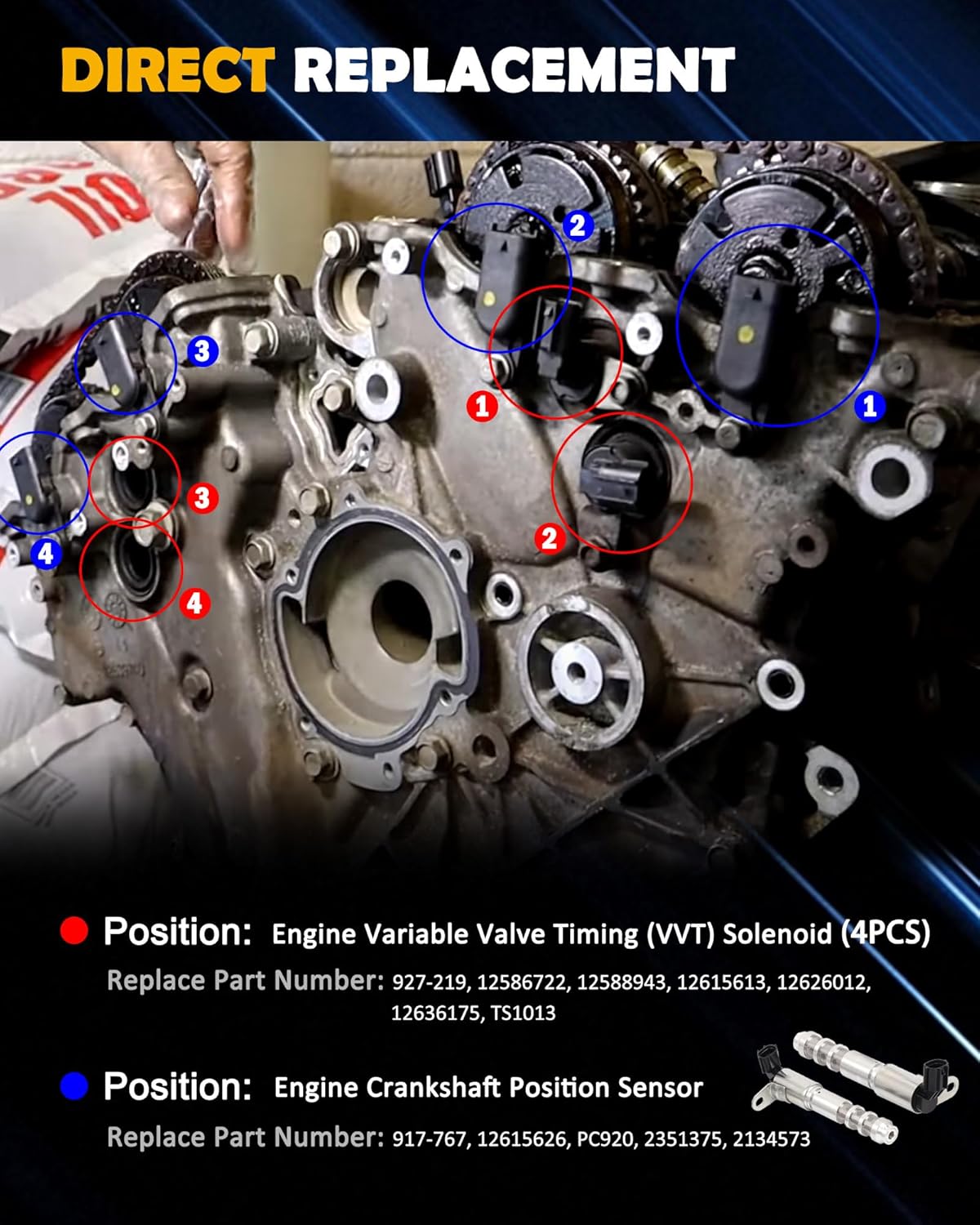 Intake & Exhaust Solenoid: 927-219, 2586722, 12588943, 12615613, 12626012, 12636175, TS1013Cam Camshaft Position Sensor:917-745, 12615371, 12684186, PC908, 2134592, 2351187Engine Crankshaft Position Sensor:917-767, 12615626, PC920, 2351375, 2134573Fitment:Buick2010-2017 Enclave V6 3.6L2010 LaCrosse V6 3.0L2010-2016 LaCrosse V6 3.6LCad2013-2015 ATS V6 3.6L2010-2014 CTS V6 3.0L2010-2019 CTS V6 3.6L2010-2011 SRX V6 2.8L2010-2011 SRX V6 3.0L2012-2016 SRX V6 3.6L2010-2011 STS V6 3.6L2013-2019 XTS V6 3.6LChevy2010-2015 Camaro V6 3.6L2012-2017 Caprice V6 3.6L2012 Captiva Sport V6 3.0L2015-2016 Colorado V6 3.6L2010-2012 Equinox V6 3.0L2013-2017 Equinox V6 3.6L2012-2020 Impala V6 3.6L2014-2016 Impala Limited V6 3.6L2010-2012 Malibu V6 3.6L2010-2017 Traverse V6 3.6LGMC2010-2016 Acadia V6 3.6L2017 Acadia Limited V6 3.6L2015-2016 Canyon V6 3.6L2010-2012 Terrain V6 3.0L2013-2017 Terrain V6 3.6LSaturn2010 Outlook V6 3.6L2010 Vue V6 3.6L