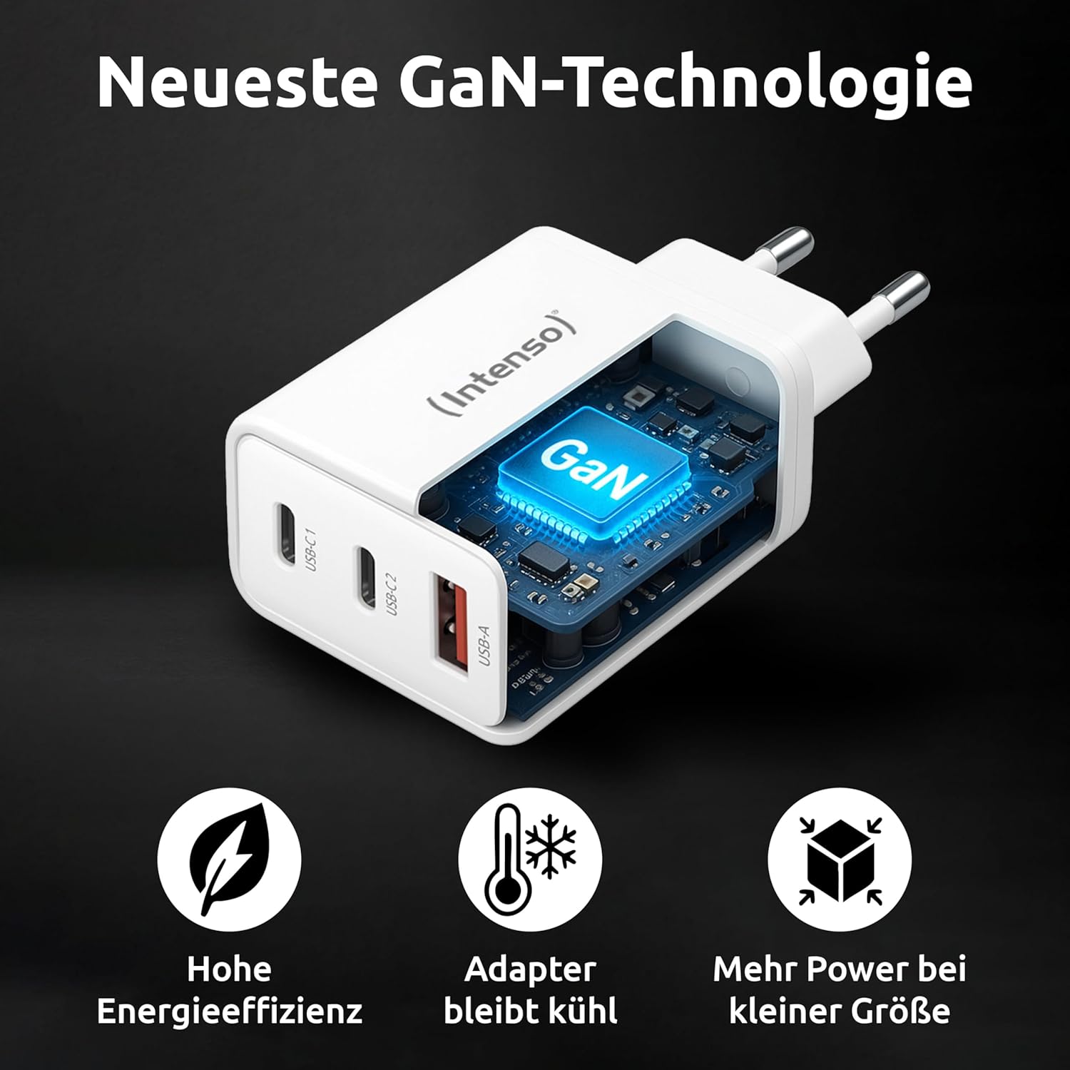 Intenso Power Adaptor W65ACC, USB Power Supply, 1 USB-A and 2 USB-C Ports, Energy-Saving GaN Technology and 65 Watts, White