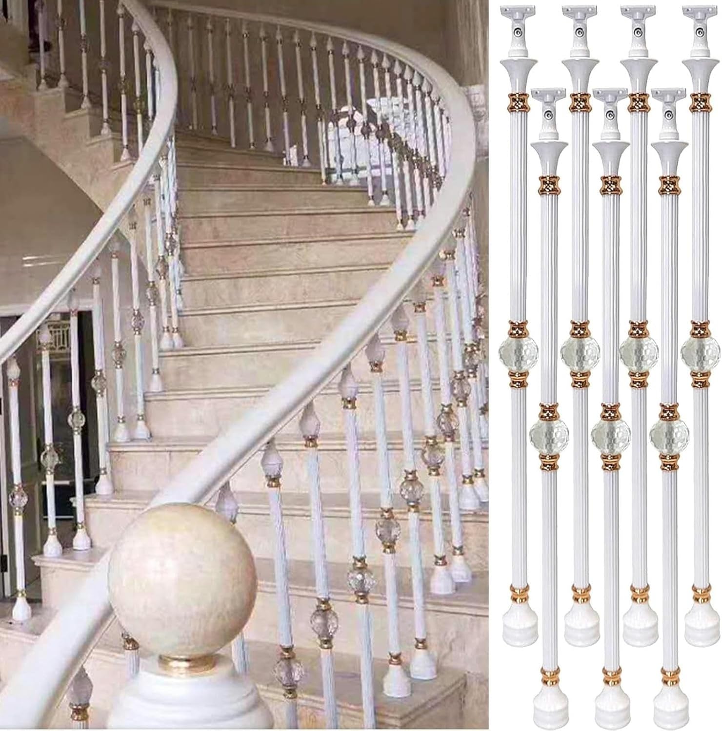 Questions you may want to ask with our answers!Q: What is the installation spacing of the posts?A: Since the spindle is narrow, it is recommended that the distance between two posts is no more than 10 cm/4 inches, which means that if your step width is wide, it is recommended to install two posts for one step.Q: Can the top fittings be rotated?A: Yes, the top can be rotated by 270 so that it can fit your stairs at any angle.Q: How do they mount to the floor?A: Comes with complete fittings expansion screws, you can install them directly on any floor very easily.Q: Are the accessories all included?A: Yes, the top, column, and bottom are all included in the package as a complete kit.Q: Is the material easy to rust?A: Don't worry, our upgraded steel post has painted surface and baked at high temperature, if it is not on the beach then it won't rust.Q: Can you install wood flooring with a railing kit?A: Posts can be installed on concrete/marble floors/wood floors/concrete floors/composite decking. (If you have hollow tiles on the floor, you can install them with mica adhesive fixing screws) Specifications- Material: Steel- Product Height: 95CM(37-2/5inches)- Baluster Quantity: 3/ 5/ 7 Pieces (You need to choose yourself)- Color: Black, White Package Content- Baluster Post & Fittings Screws