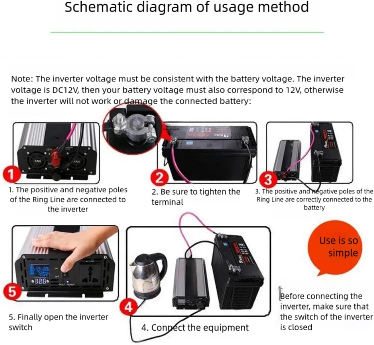 Power InvertersSpecifications:Input voltage: 12VOutput voltage: 220VOutput frequency: 50HzOutput voltage waveform: pure sine wave inverterSocket: universal (commonly used in sockets in all countries)Model: 1000WWaveform: pure sine waveRatwd power: 500WPackage size: 25*17*7cmGross product weight: 0.85 KGModel: 1600WWaveform: pure sine waveRatwd power: 800WPackage size: 30*17*7cmGross product weight: 1.1 KGModel: 2200WWaveform: pure sine waveRated power: 1100WPackage size: 35*17*7cmGross product weight: 1.5kgModel: 3000WWaveform: pure sine wavePower rating: 1500WPackage size: 35,5*17*7cmGross product weight: 1.6 KGThe inverter has maximum power and continuous power, the continuous power is half of the maximum power.Packaging details:1 x battery clip1 x battery thick wire1 x Certificate of Conformity1 x user manual1 X pure sine wave inverterIf inductive load appliances are used, the power of the inverter must more than three times the power of the appliances to operate.For example, inductive load appliances such as refrigerators, washing machines, ice machines, electric drills, sanders, hairdryers, etc.Inverter 12V 220V pure sine wave 1000W 1600W 2200W 3000W 12V to AC 220V portable power supply inverter solar inverter converter1. This inverter has a power range of 1000W-3000W and can power multiple devices simultaneously. This Product is in the category of inverters and converters, and is a device that converts direct current to alternating current.2. It can convert 12V to AC 220V, and it is also portable and can be used together with solar panels. It is suitable for both residential and commercial use.