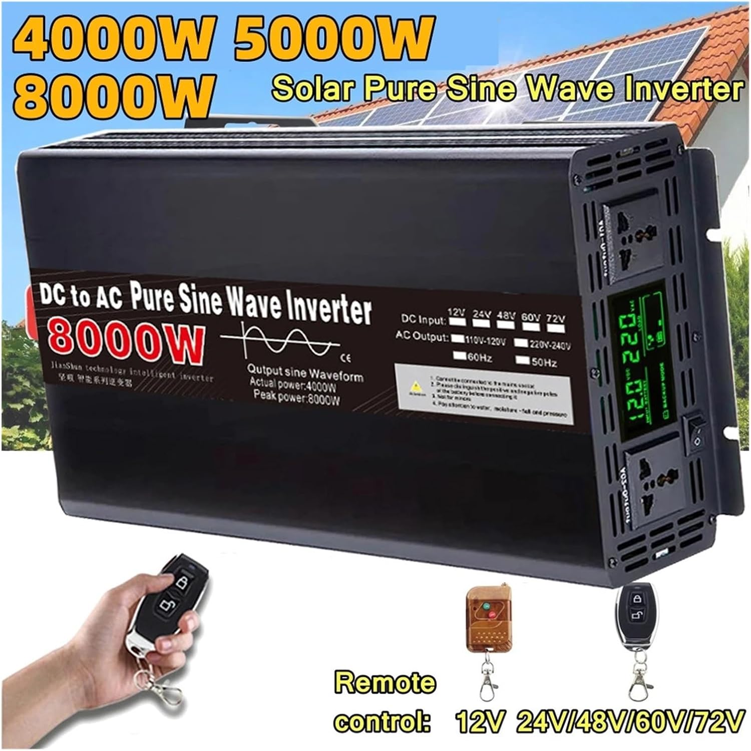 InvertersInverterSpecificationPeak Power: 5000W / 6000WContinuous powe:2500W / 3000WOutput voltage:110V,120V,220V,230V,240V(±10%)Input voltage: 12V/24V/48V/60V/72VOutput frequency: 50Hz±2H/ 60Hz±2H