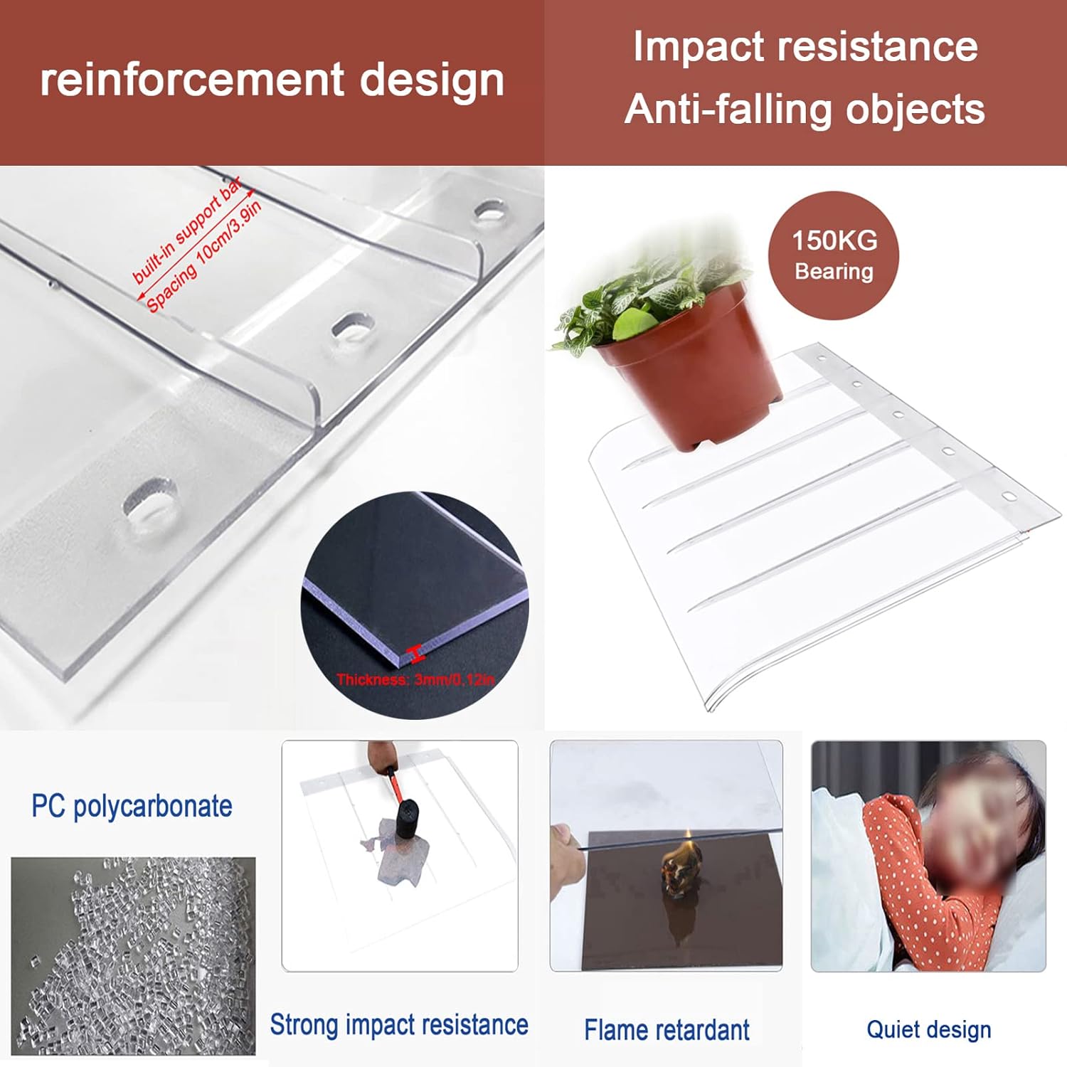 The canopy features a thickness of 3mm and can support up to 150KG (330 lbs), ensuring it withstands various weather conditions. With dimensions available in widths of 40cm (16in) and 50cm (20in), you can select the perfect size for your space. The installation method is flat, providing a seamless look that doesn’t detract from your home’s design. Included in the package are all necessary accessories, such as expansion bolts, self-tapping screws, and metal washers. We encourage you to measure your window or door before selecting the appropriate size, and we offer customization options for those with specific needs.