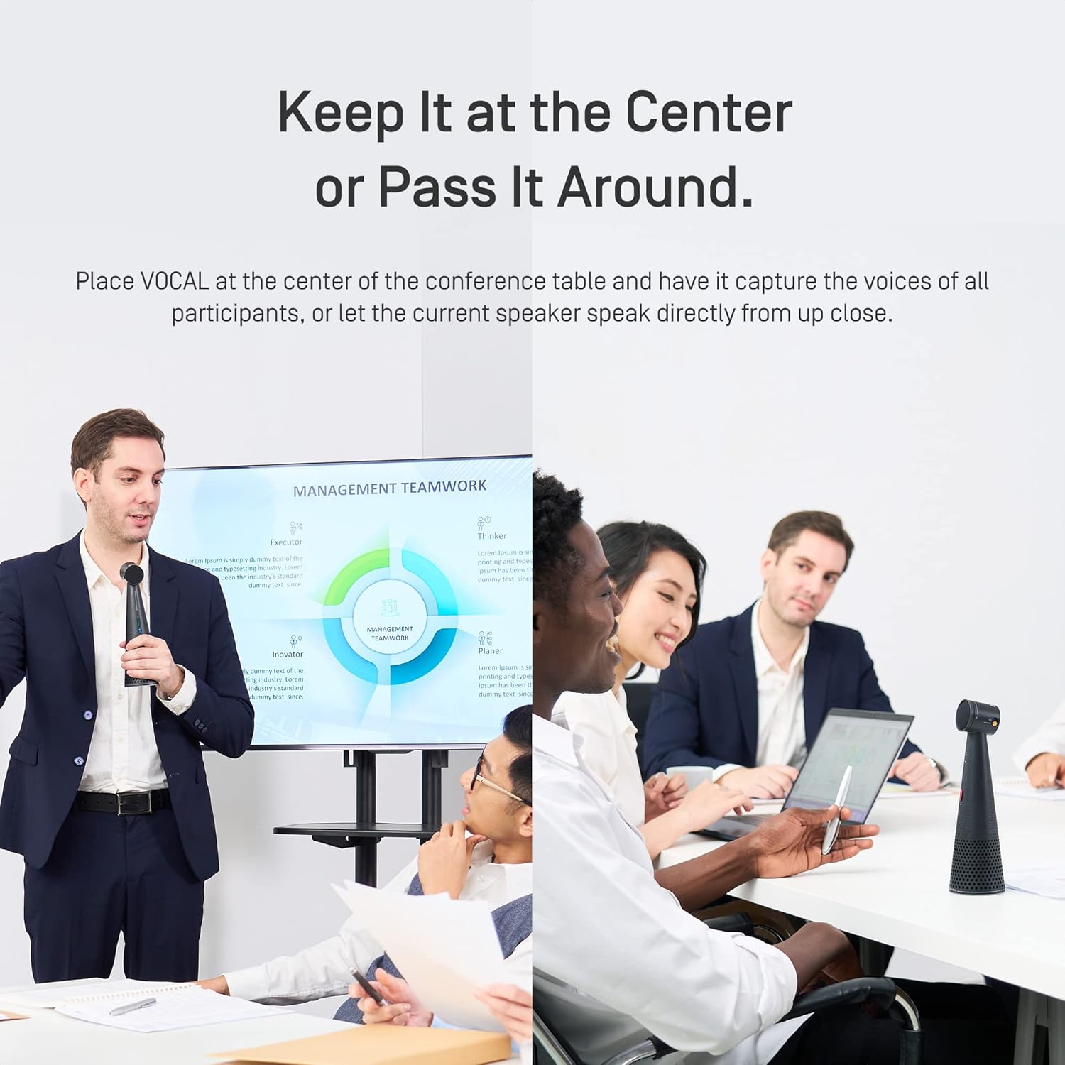 IPEVO VOCAL AI Beamforming Bluetooth Speakerphone. Be Heard! Experience crystal-clear conference calls with IPEVO VOCAL. VOCAL is the world’s first speakerphone with two-way AI noise reduction technology, which reduces the background noise on both ends of the line, ensuring clear communication in any environment or setting. This means you can filter out the noise in your meeting room as well as the noise on the other end of the call and focus on what matters most. VOCAL's intuitive design allows for a confident and natural posture, and the wireless functionality allows the speakerphone to be easily passed around the table for greater adaptability. Its two microphone modes utilize beamforming technology and allow capturing sound in a 360° or 120° range. This way, users can choose to capture everyone's voice or focus on a specific participant. With up to 40 hours of battery life and convenient USB-C charging, VOCAL is always ready to go when you need it. Say goodbye to muddled conference calls and hello to clear communication with IPEVO VOCAL.