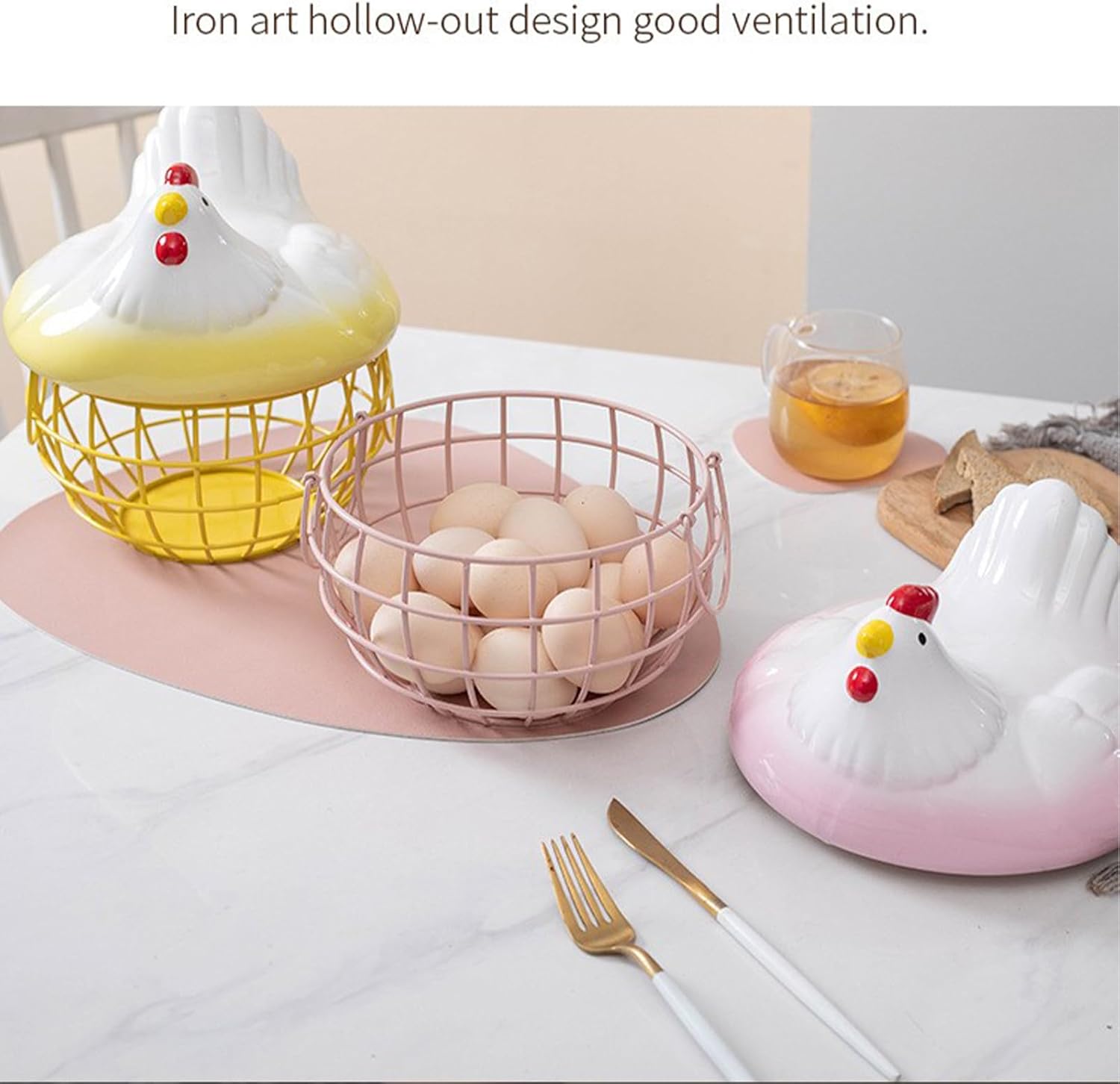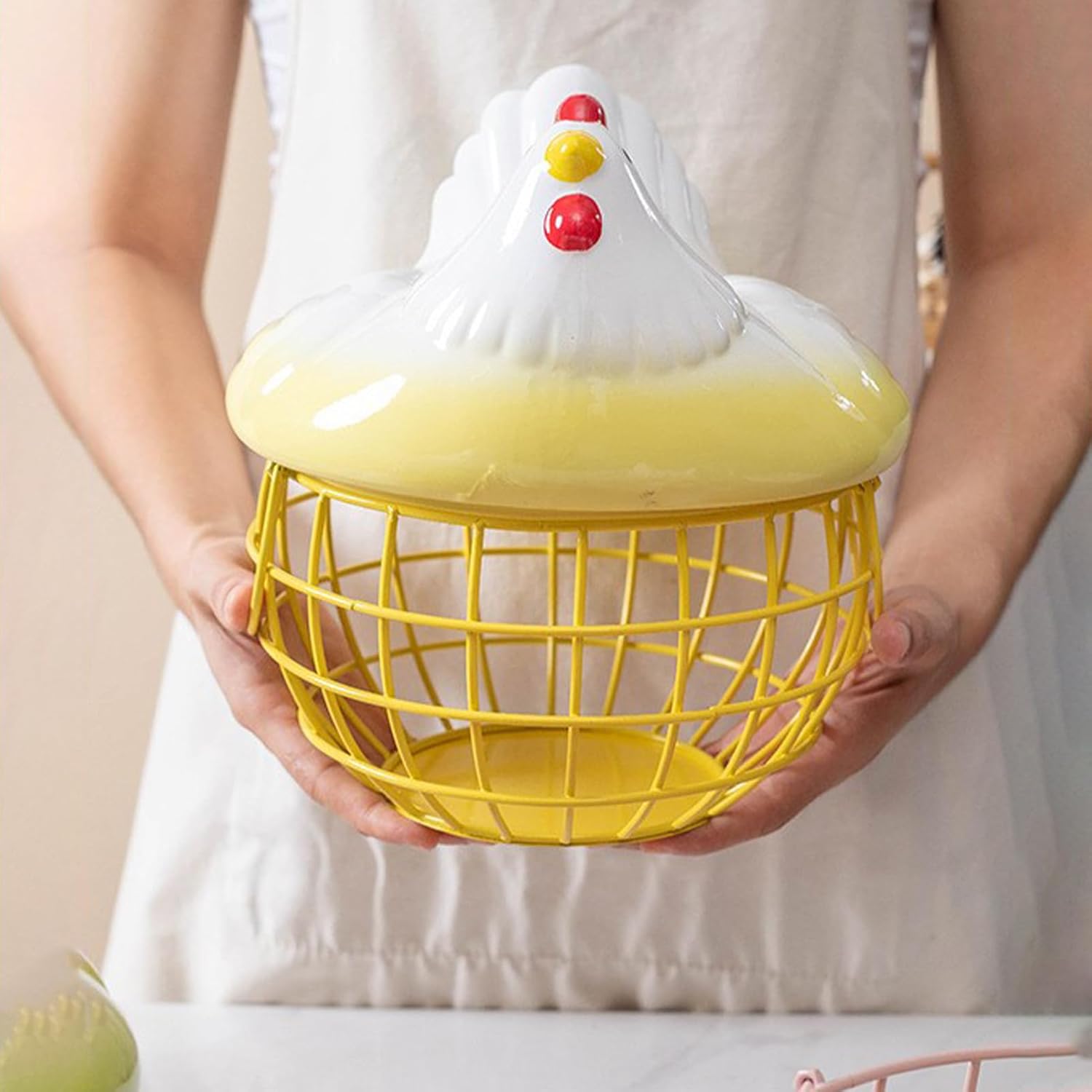 Feature: 1: High quality: The egg basket is made of high-quality ceramic and iron materials. The chicken-shaped lid is made of ceramic, and the basket for eggs is made of iron. 2: Large capacity: The bottom diameter of the basket is about 19.5cm, the height is about 12cm, and it can hold about 25 eggs. Meet daily storage needs. The lid is about 21.5cm wide and 12.8cm high. 4: Handle design: The iron egg basket has two handles, which is sturdy and easy to move and easy to maintain. 3: Cute shape: The vivid chick shape is cute and charming. The thickened frame and large opening design are easy to take, sturdy and can be used for a long time. 5: Multifunctional basket: The hollow design of the iron basket is well ventilated. It is not only suitable for storing eggs, but also for placing various small objects, and even for placing fruits and vegetables. Specification: