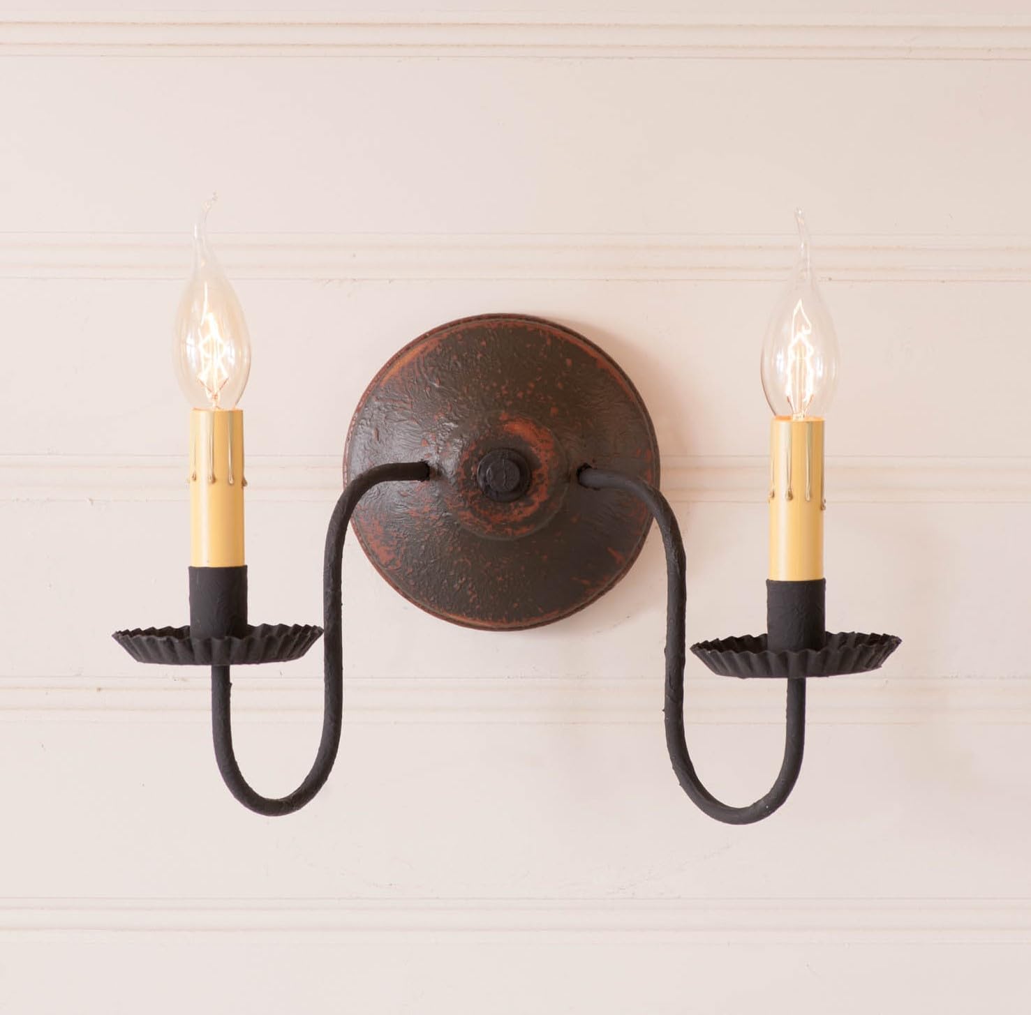 We have stepped back in time to recapture the glow of candlelight with our Ashford Wall Light. It will shed its glow above or beside a mirror in a powder room or an entry hall.Direct wired with two E12/Candelabra sockets, 60 watts max. per arm. Textured Espresso with Salem Brick stripe body color. Black textured arms and pans. This sconce is UL-CUL listed and has a 5 year guarantee. Handcrafted in Pennsylvania.