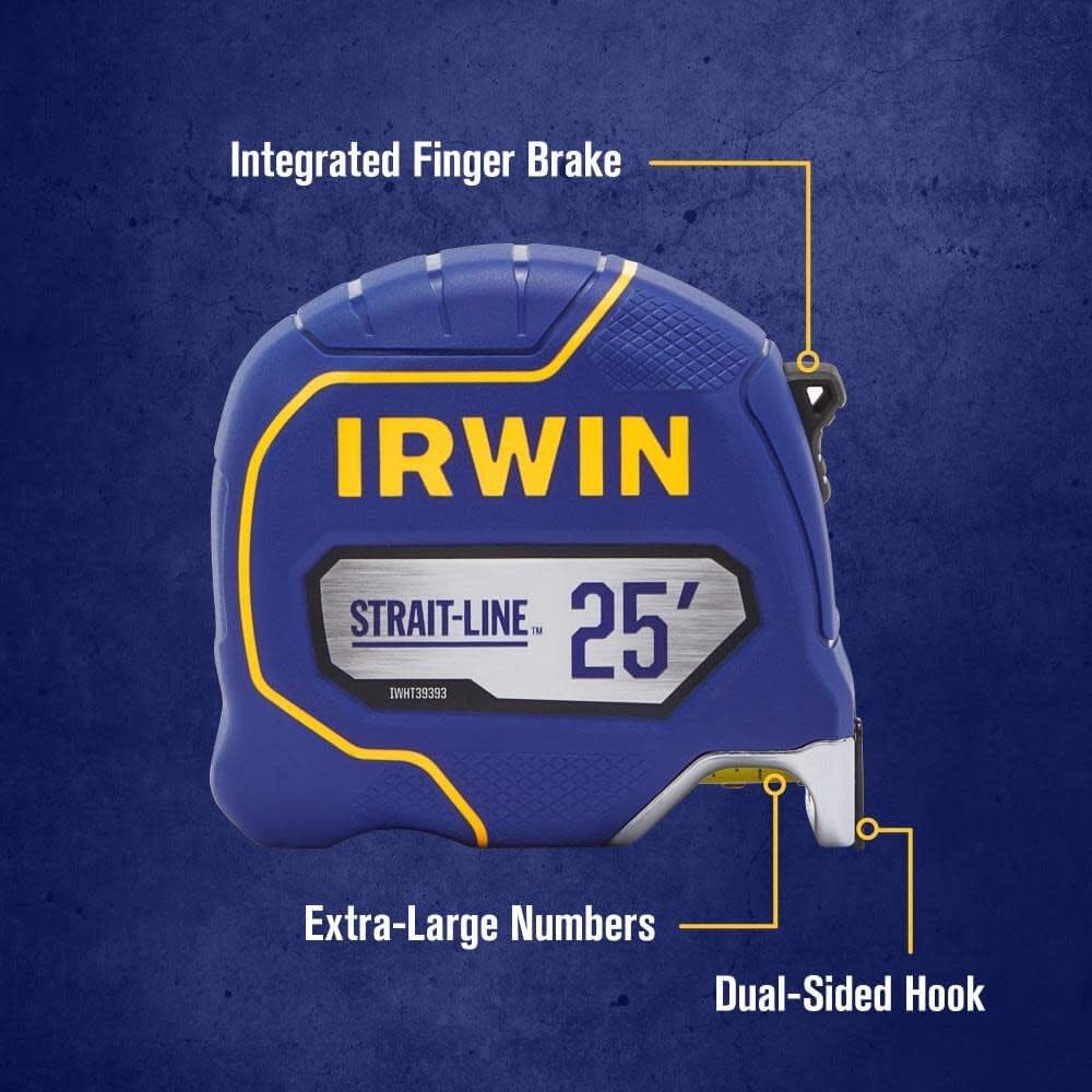 We know you need tools that work as hard as you do, and that's why each IRWIN STRAIT-LINE Tape Measure is engineered to exacting standards to reach further, last longer and provide reliable accuracy wherever your next job takes you. IRWIN STRAIT-LINE blades deliver 25-ft of straighter, more rigid reach when working alone while also being able to withstand extreme punishment on the jobsite, including surviving up to an 80 foot drop. With an integrated finger brake to improve retraction control, a durable blade coating, 6 inches of additional protection to prevent tearing near the hook, double-sided print for vertical and overhead measurements, and large, easy-to-read numbers, this tape measure is built from the ground up for the hardworking tradespeople who build our homes and infrastructure, keep the lights on, and keep our water flowing.