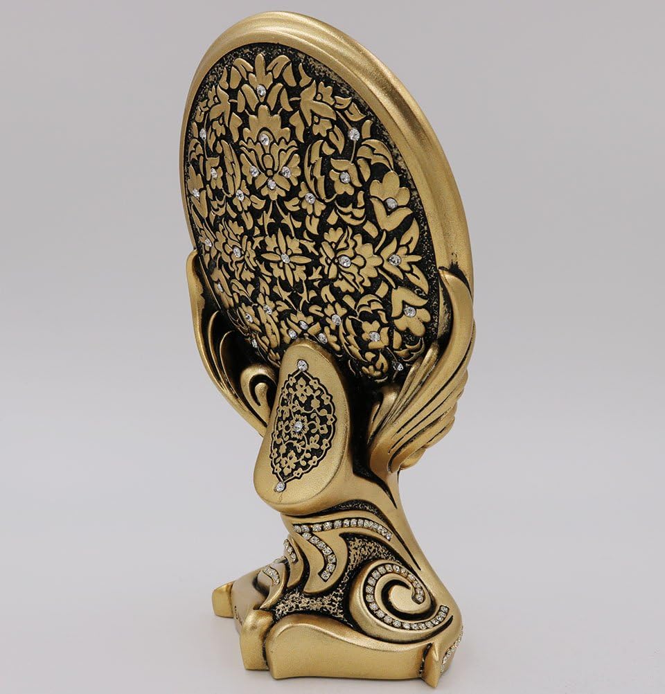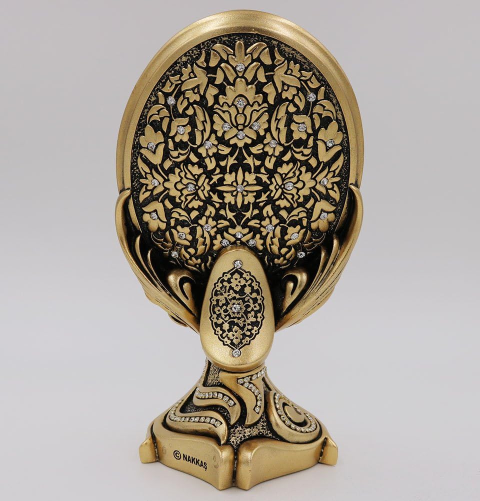 Islamic Home Decor Showpiece Oval-shaped table decor piece inscribed with Arabic calligraphy Features intricate detailing and is accented in rhinestones. Choose from "Allah", "Muhammad," Ayatul Kursi, or Nazar Dua! Material: Resin Size: 8in tall, oval is 4in wide at widest point. Made in Turkey. Due to the manufacturing process and hand-finished detailing, this item may have minor imperfections.