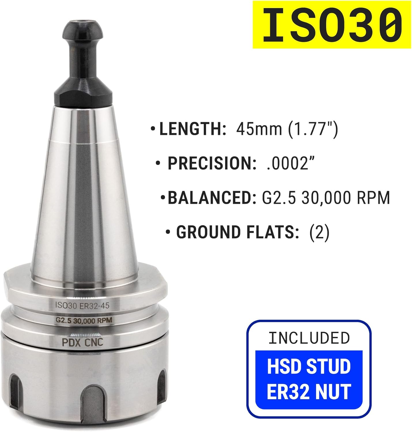| Included Components | ER32 nut, HSD Pull stud, ISO30 Tool holder |