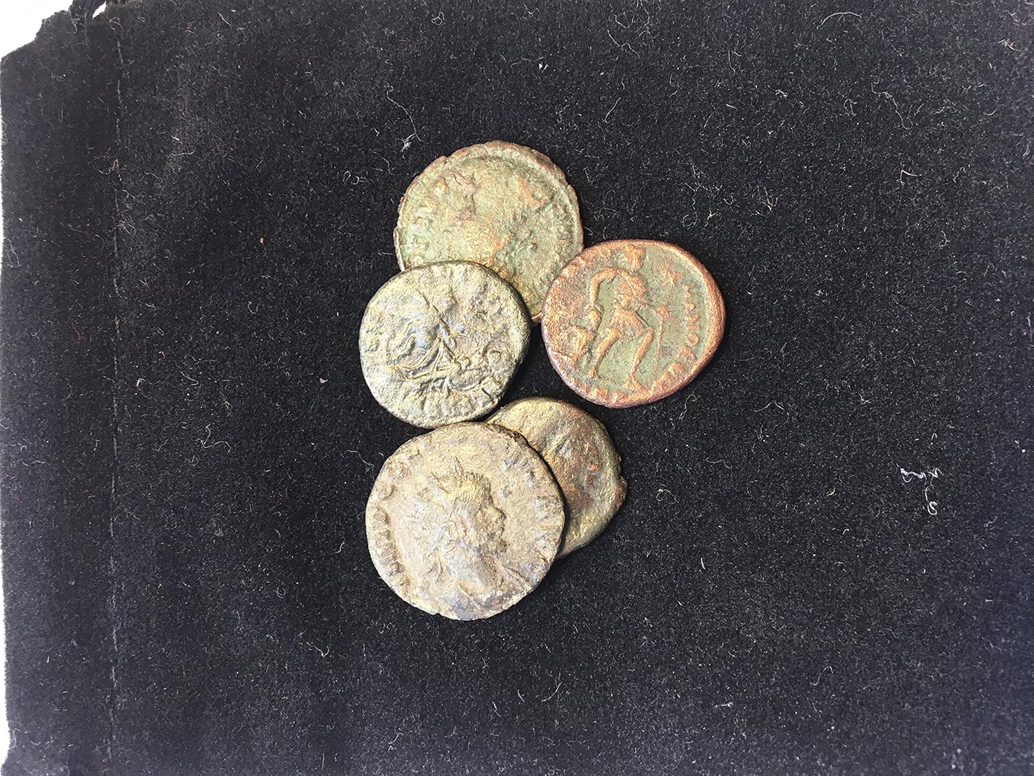 You get 5 genuine bronze Roman coins in a black velvet bag. These coins have been slightly cleaned to show off their designs. Most are from the Constantine the Great. Time line 274 AD- 337 AD