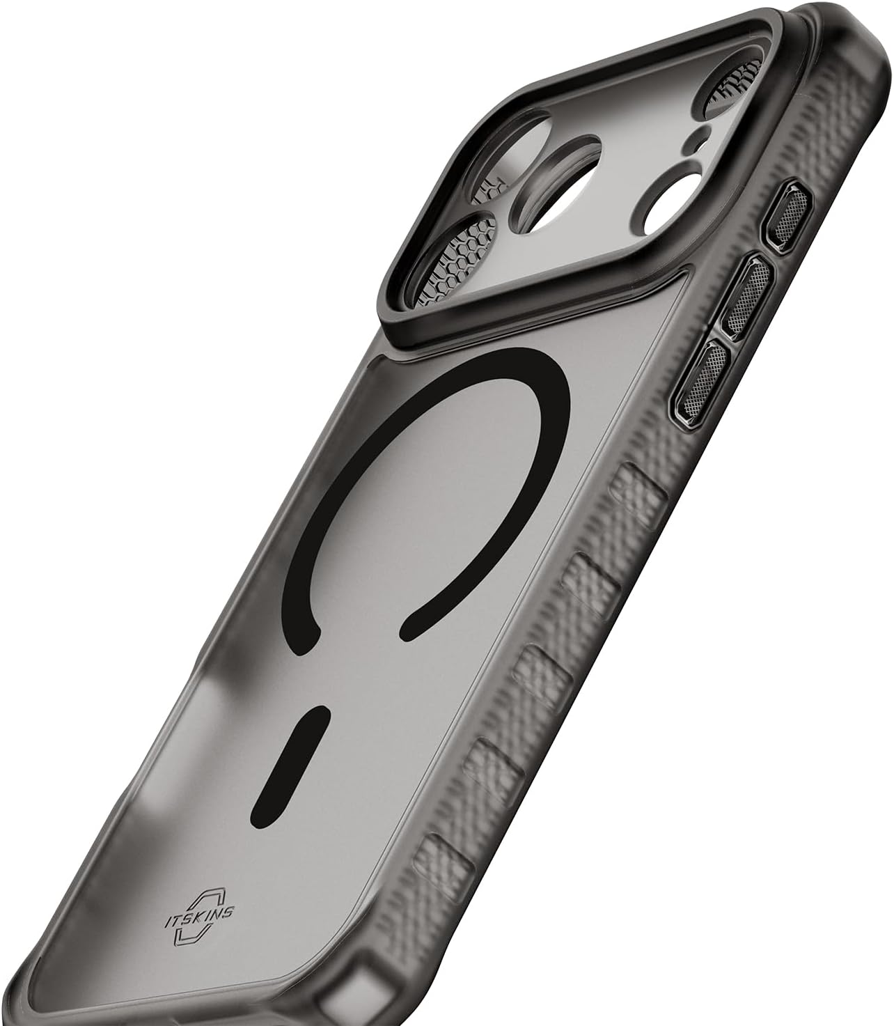 Enhance both style and protection for your Apple iPhone 15 with the ITSKINS Hybrid R Frost Magnetic Phone case. Experience the perfect balance of flexibility and durability with our flexible slim, lightweight case. This military grade case provides the ultimate defense against drops, scratches, and cracks while maintaining an aesthetic appeal. The raised edges safeguard your screen and camera, ensuring they remain impervious to potential damage. Featuring strong magnetic designs, the magnet ring is placed between two plates for durability without sacrificing attachment strength. It has built-in magnets that work seamlessly with a MagSafe charger and other accessories. Engineered with Hexotek shock absorption technology and a body bumper protection system, this military phone case is designed to withstand accidental drops and impacts. It offers military-grade drop protection of up to 3 meters (10 feet). Reinforced corners with advanced shock-absorbing materials to ensure that your phone remains secure and well-protected. The ultra-responsive buttons retain the original tactile feel, providing effortless navigation and control. It also has an anti-slip design to add extra grip to the sides. This slim protective case allows you to exhibit your phone's premium aesthetic design while delivering enhanced protection. Features a beautiful, smoky matte frosted finish with an anti-scratch surface, ensuring the integrity of the case remains intact with its solid hardback design, this heavy duty phone case has undergone comprehensive testing for quality and performance, presenting durability and dependable defense against daily wear and tear. Upgrade your phone's essential protection with ITSKINS – combining ideal fashion, style, and functionality.