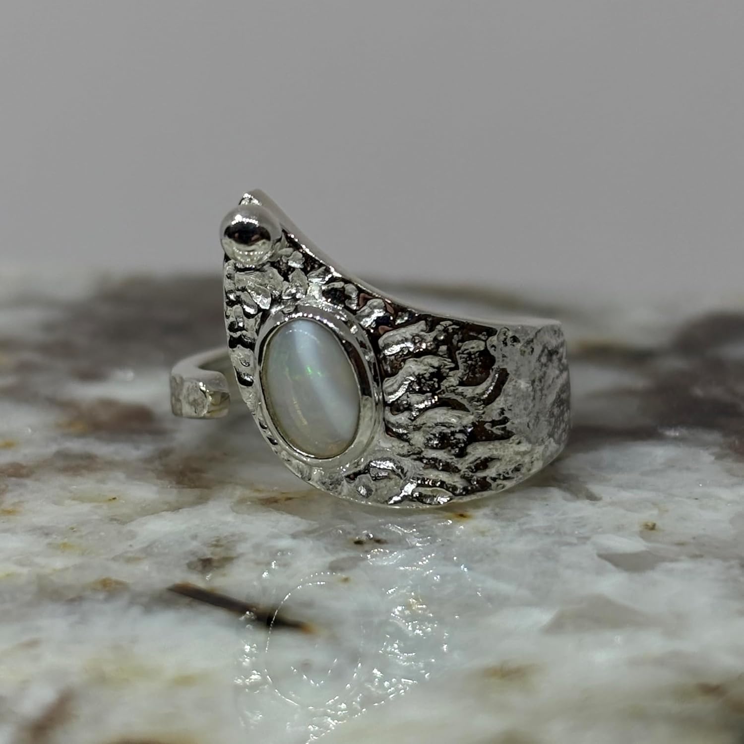 A true crown is earned long before it is worn. | Type - Crystal | Location - Jalisco, Mexico | Weight - 0.35 Cts | Size - 6.5mm x 4mm x 2mm | Cut - Oval | Pattern - Rolling Flash | Brightness - B2 | Metal - .925 Sterling Silver | Ring Size - Wrap Around Adjustable