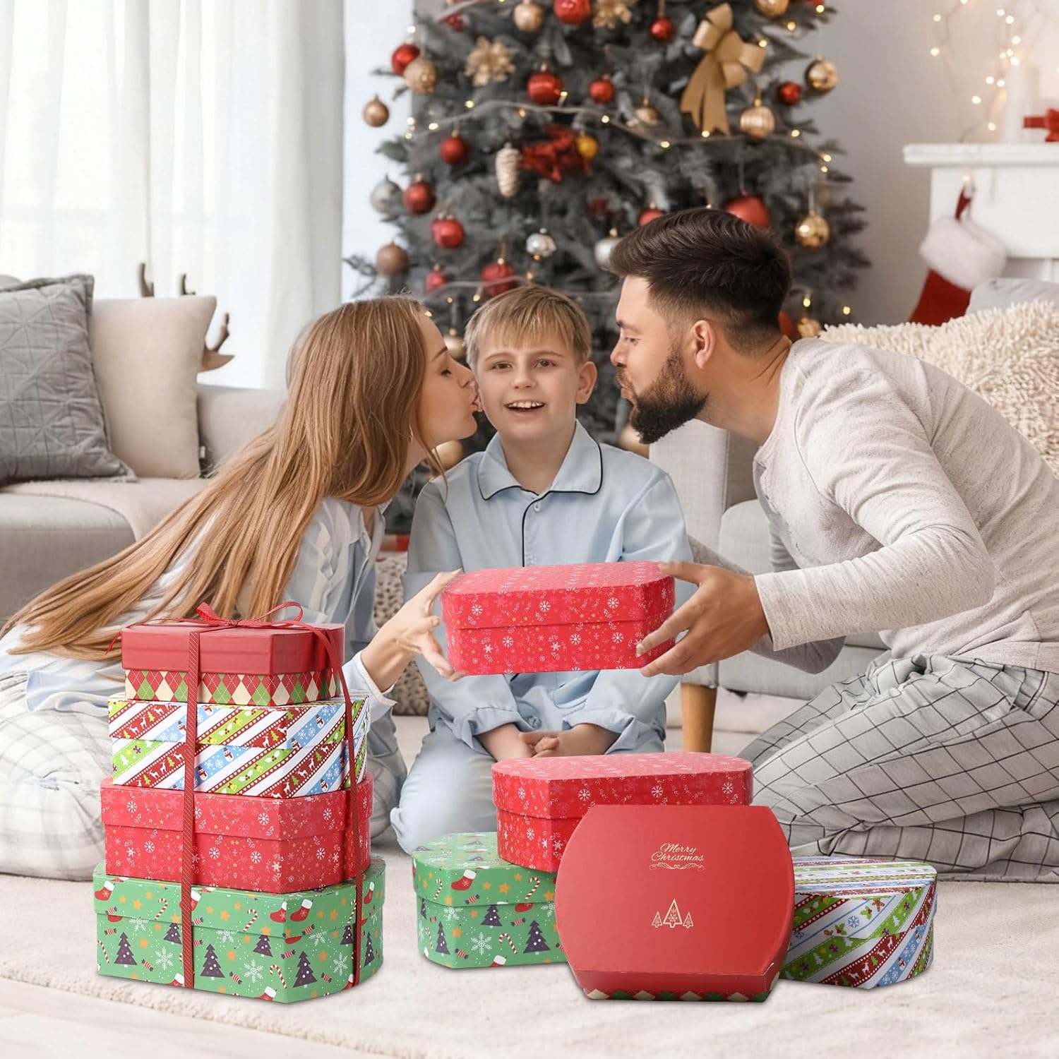 Features: Christmas decoration: Our decorative christmas boxes with lids design has a very strong Christmas atmosphere. In addition to packaging gifts, it also has a pleasing appearance as a decoration on the center table or cabinet, bringing you enough enjoyment for your Christmas. Show personality: Our Christmas nesting gift boxes come with threaded gold stamped satin ribbons and plenty of Christmas cards. You can use the ribbons to show your personal creations, make a special gift box, and write a congratulatory message to show your precious gift. Specifications: Material: card stock Color: multicolor Size: about 10.2 x 7.9 x 3.5 inches/ 26 x 20 x 9 cm About 9.4 x 7.5 x 3.1 inches/ 24 x 19 x 8 cm About 9.1 x 6.7 x 3.1 inches/ 23 x 17 x 7.8 cm About 7.5 x 5.9 x 2.4 inches/ 19 x 15 x 6 cm Package includes: 16 x Christmas gift boxes with lids 1 x Gold stamped satin ribbons 16 x Christmas cards Notes: Manual measurement, please allow slight errors on size. The color may exist a slight difference due to different screen displays