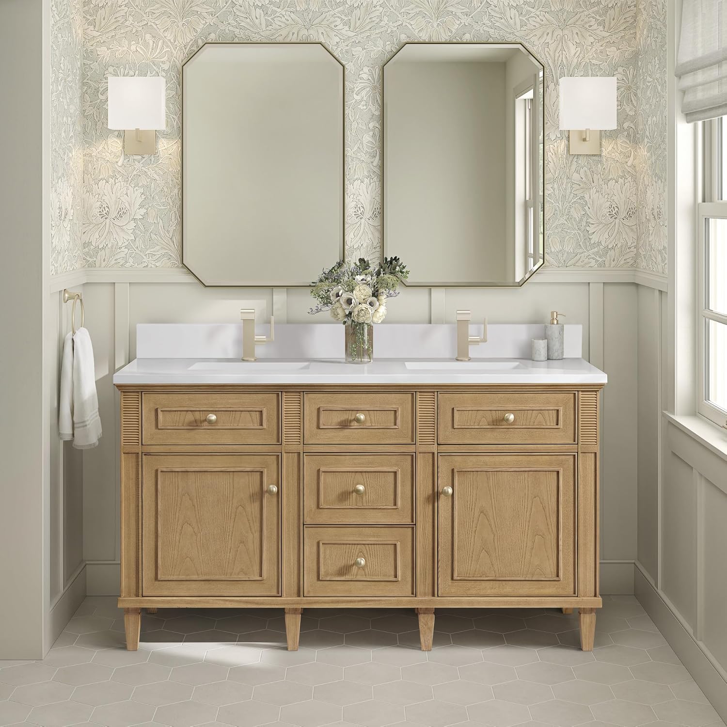 James Martin Vanities 424-V60D-1WZ Lorelai 60" Double Basin Wood Vanity Set with 3cm White Zeus Silestone Quartz Vanity Top, Rectangular Sinks and Electrical Outlet - Single Faucet Hole - Whitewashed