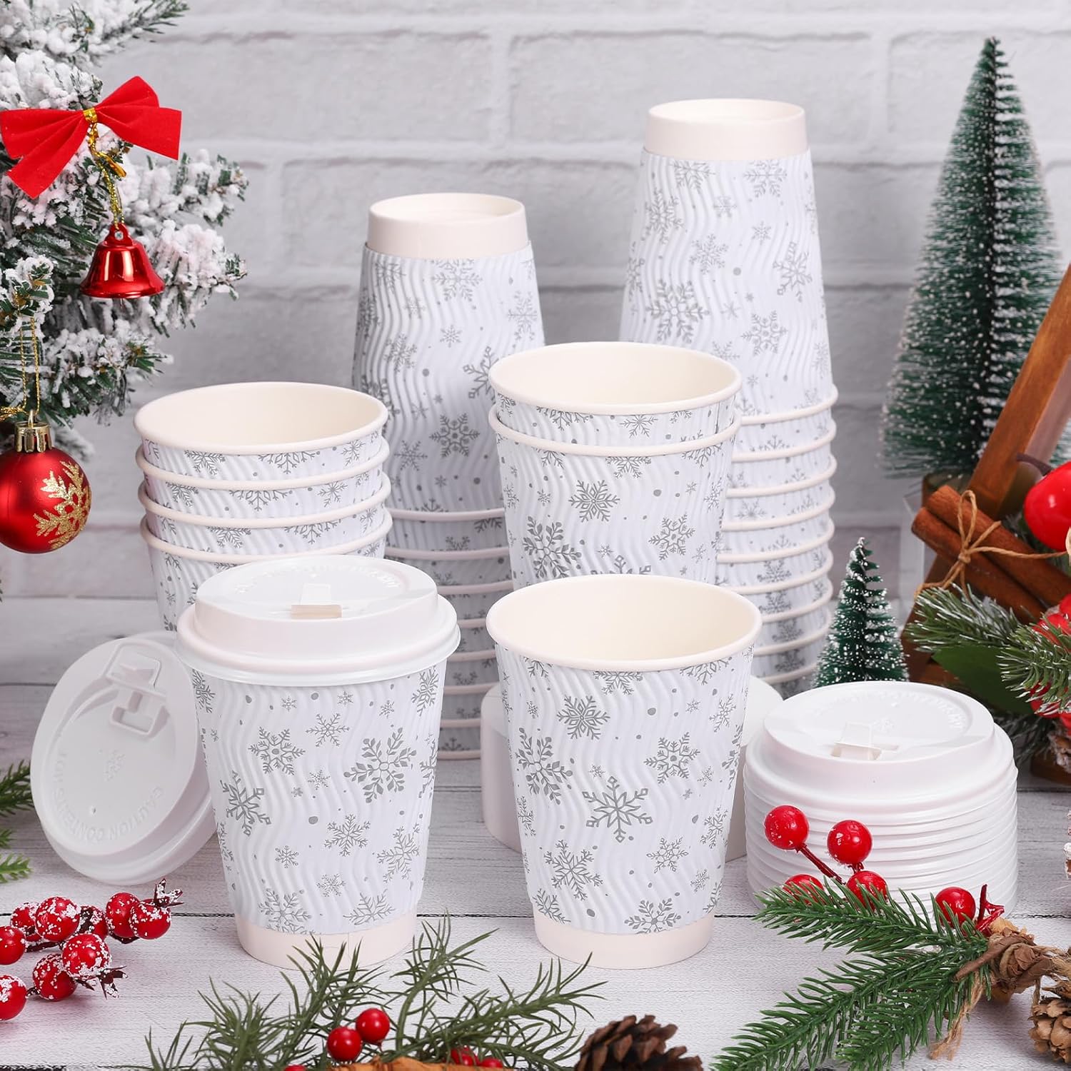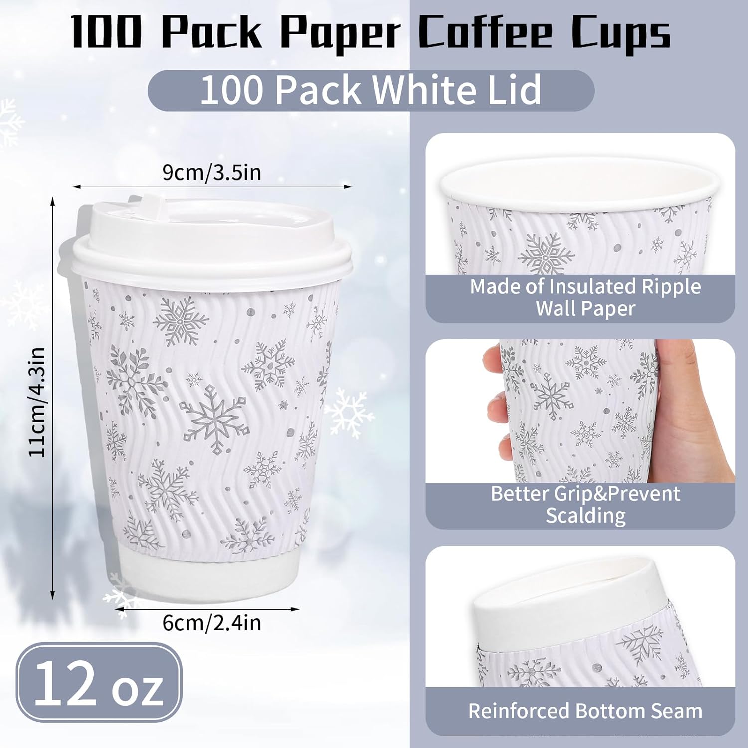 Features: Great decor: Elegant Christmas snowflake paper cups can adding much charm to your parties, suitable for many occasions. Practical supplies: These paper cups are convenient to use, thick and sturdy, disposable design is easy for you to clean, proper size is perfect to use. Specifications: Material: corrugated paper Size: 3.5 x 2.4 x 4.3 inch, 12 oz Package includes: 100 x Paper Cups 100 x Lids