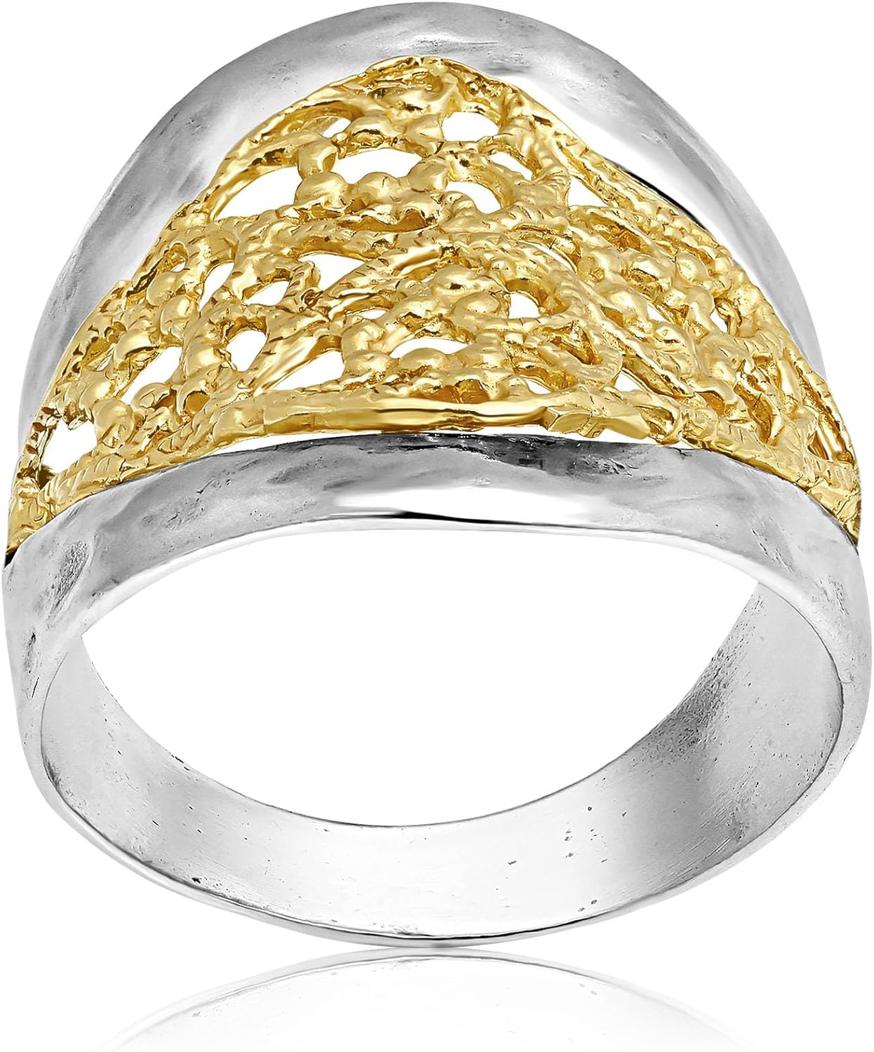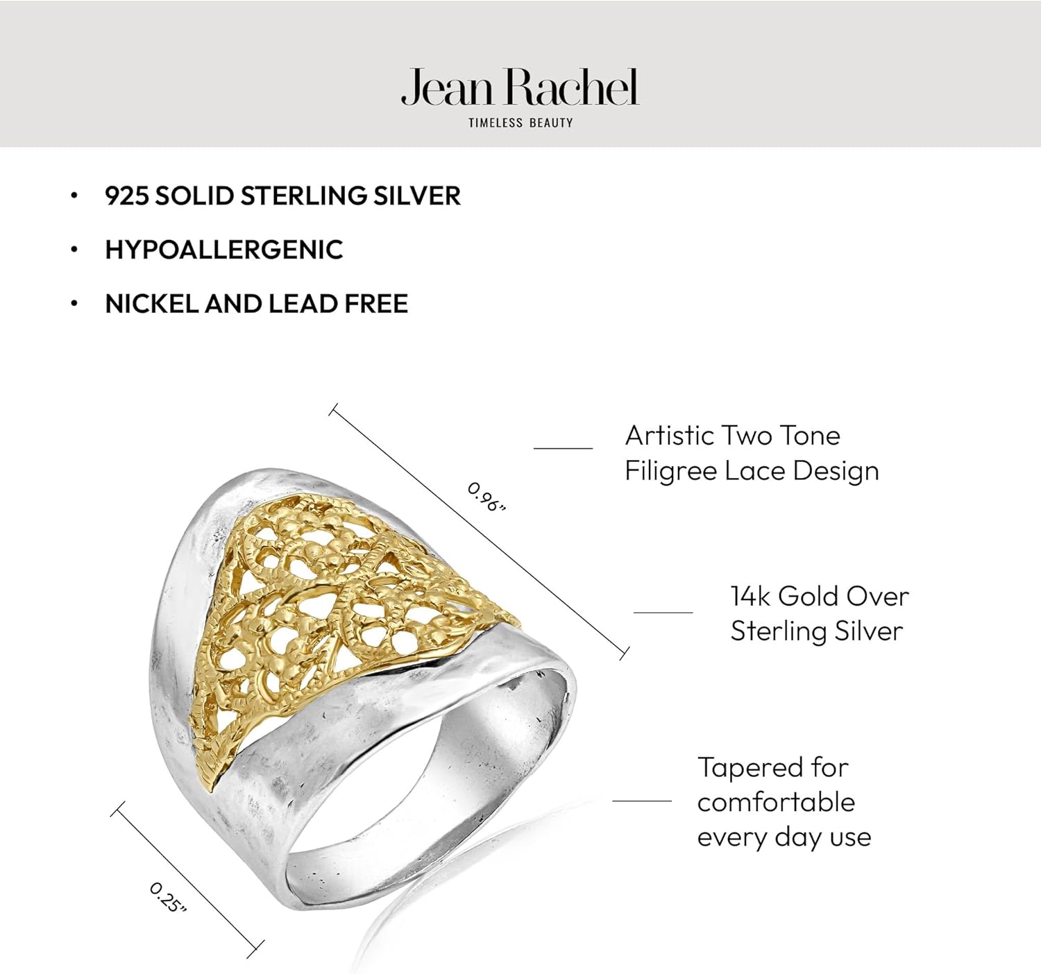 Celebrate bold elegance with the Mixed Metal Lace Statement Ring by Jean Rachel Jewelry. This handcrafted piece features an intricate gold-plated filigree lace set over a gently hammered sterling silver band, creating a soft, sculptural silhouette with a refined finish. Thoughtfully designed, the ring tapers from 0.9" in the front to 0.25" in the back for everyday comfort, allowing for a secure fit without sacrificing style. The mixed-metal composition enhances its versatility—easy to wear with your favorite silver or gold pieces. From brunch to evening events, this ring brings texture, artistry, and a timeless statement to any look. It's perfect as a signature piece or a meaningful gift for someone who appreciates wearable craftsmanship. Crafted from hypoallergenic, nickel- and lead-free metals, it's safe for sensitive skin and built to last. Discover the perfect blend of bold design and effortless sophistication.