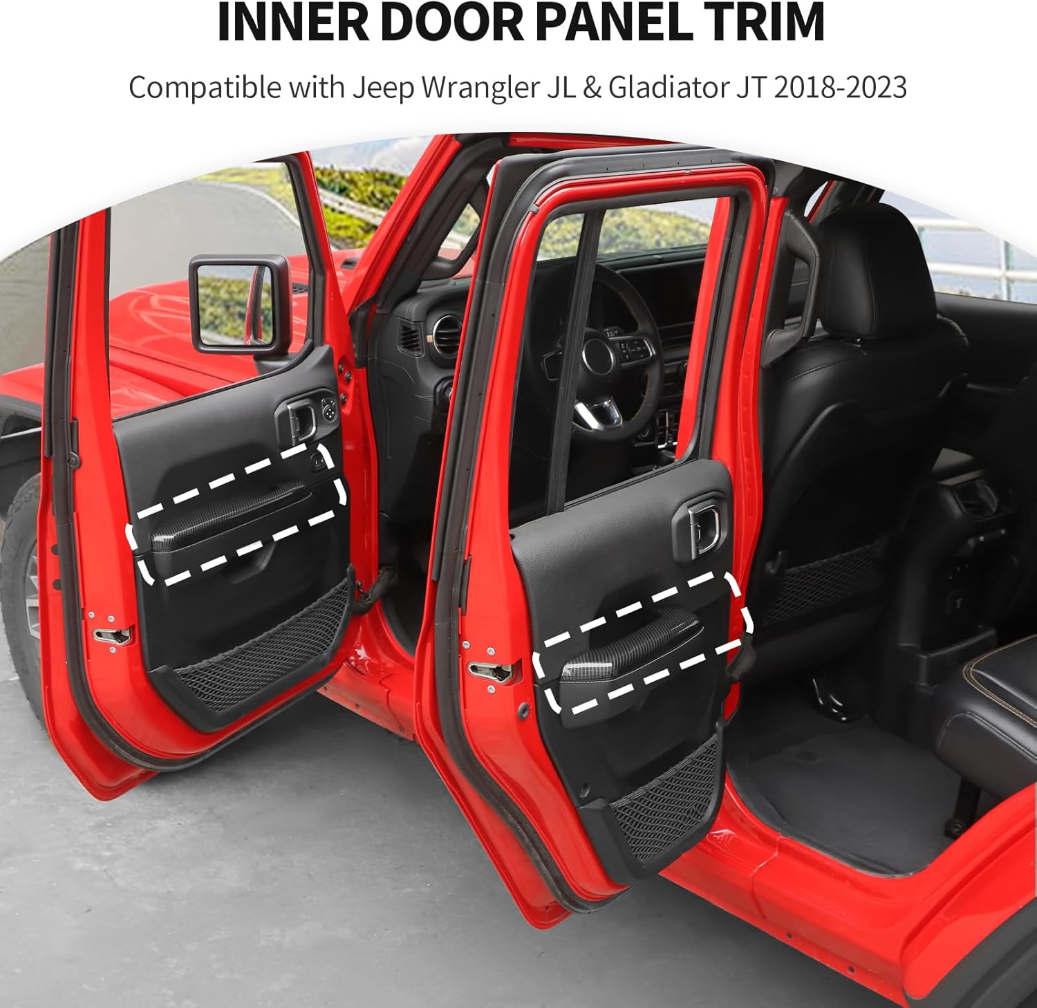 Fitment: - Compatible with Jeep Wrangler JL 4-Door 2018 2019 2020 2021 2022 2023 2024 2025 2026. - Compatible with Jeep Gladiator JT 4-Door 2020 2021 2022 2023 2024 2025 2026. Features: - Easy to install - Made of durable and long lasting ABS - Prevent the interior from finger nails, keys scratches Installation Guide: - Step 1. Use rubbing alcohol to clean all the places where the inner door panel cover will be pasted - Step 2. After the alcohol has dried, heat the tape with a lighter or blower - Step 3. Paste the door panel trim in the corresponding position - Step 4. Press the door panel trim firmly into place Package Included: - 4 x Interior door handle trims