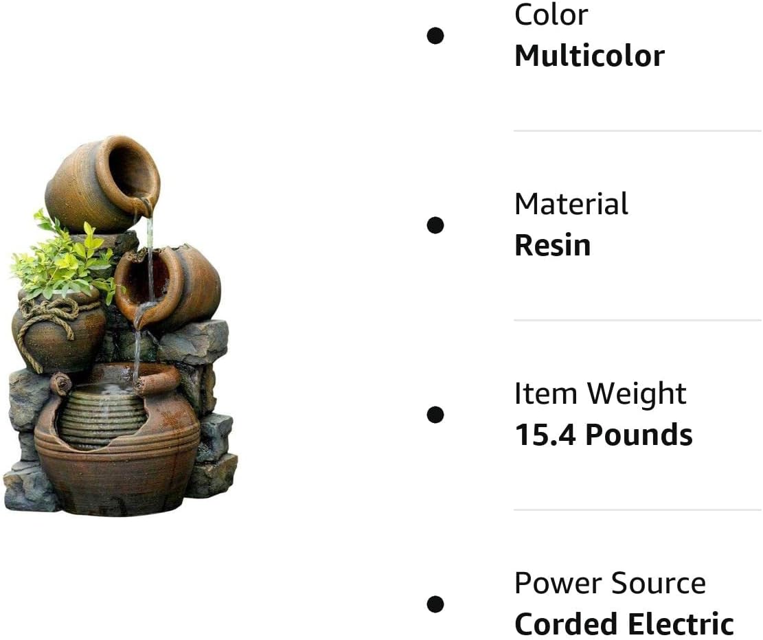 The Jeco FCL055 Multi Pots Outdoor Water Fountain and Alpine Corporation TIZ194BZ Outdoor Floor Rustic 2-Tiered Barrel and Pump Water Fountain bundle includes two decorative outdoor water fountains to enhance your garden or patio. The Jeco fountain features a multicolor design with three pouring levels spanning 23.6 inches high, 12.6 inches long, and 13.4 inches wide. It includes flower pots and holds 2-3 gallons of water powered by a 110V electric pump with a 5 foot power cord. The durable polyresin and fiberglass construction is weatherproof. Complementing it is Alpine Corporation's 27-inch high bronze barrel fountain with plastic construction resistant to weather and rust. Water flows from the pump spout into two faux wood barrel tiers for an old-fashioned country look. The 16 x 18 inch footprint works well in yards and has a 5 liter capacity. Together these two fountains provide relaxing cascading water sounds to create a peaceful outdoor ambiance. The Jeco fountain offers a colorful, decorative accent while the Alpine fountain provides an earthy, rustic charm. Displayed together, they balance modern and traditional styles. Their small-to-medium sizes make them easy to arrange in harmony. As a bundle, they provide flexible options to enhance a variety of outdoor living spaces.