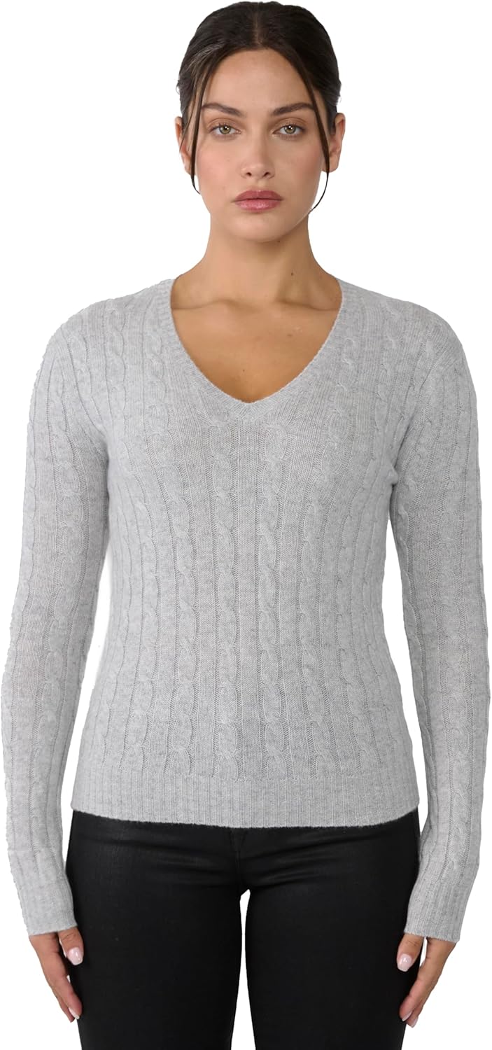 Gracefully crafted with premium cashmere, this Cashmere Cable-knit V Neck Sweater has an easy fit silhouette. It features a ribbed crewneck, ribbed cuffs and hem. A timeless fisherman 3-ply chunky raised cable-knit textures this luxuriously soft and cozy sweater. Super comfy and lightweight, this chic cashmere sweater is a special gift to treasure and enjoy.We traveled the remote mountains of Mongolia to deliver this sweater with the worlds finest cashmere. This Cashmere Cable-knit V Neck Sweater is densely knitted with yarns gently spun from the latest Italian technology, it represents the ultimate pilling performance of its class, lightweight yet extremely cozy with superior soft hand.This Cashmere Cashmere Sweaters for Women are investment pieces to treasure and enjoy. Cashmere of this quality only gets better over time. With proper care, this sweater is going to take good care of you for years to come.