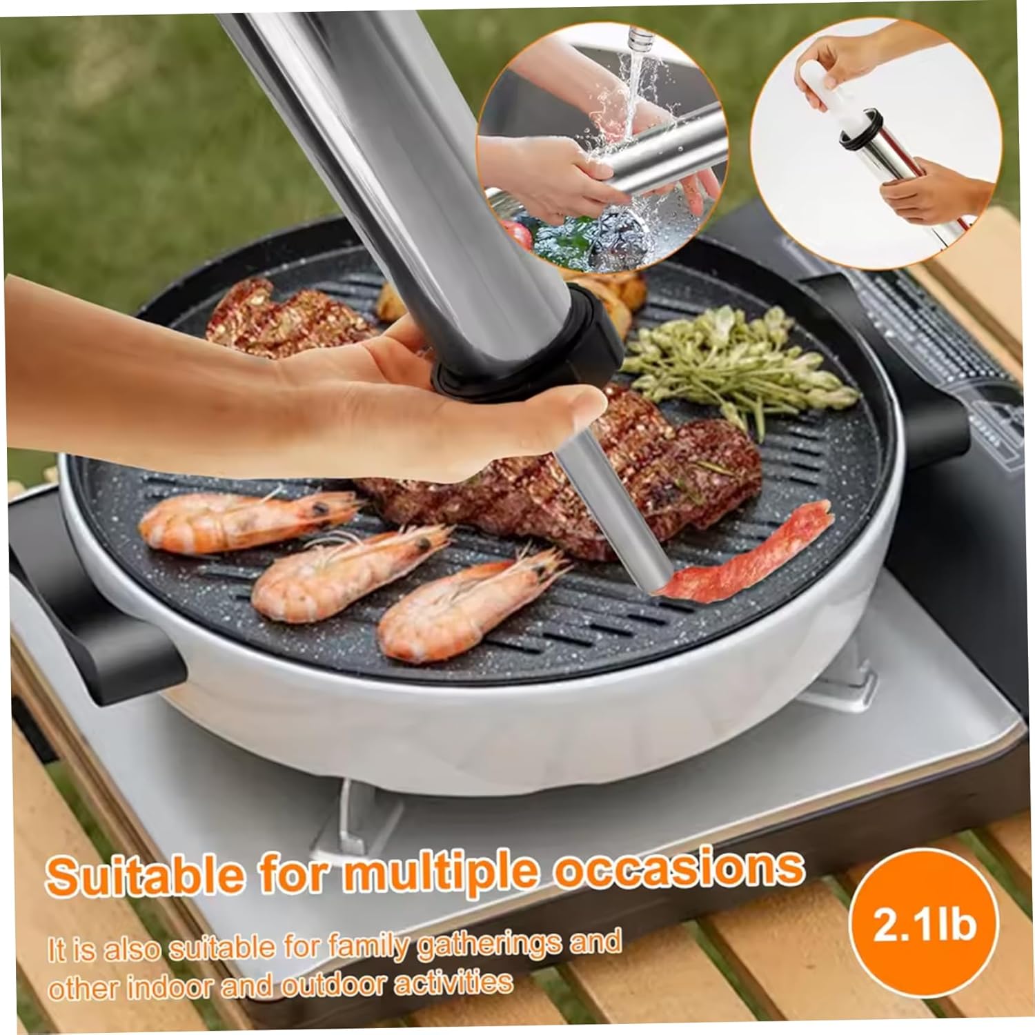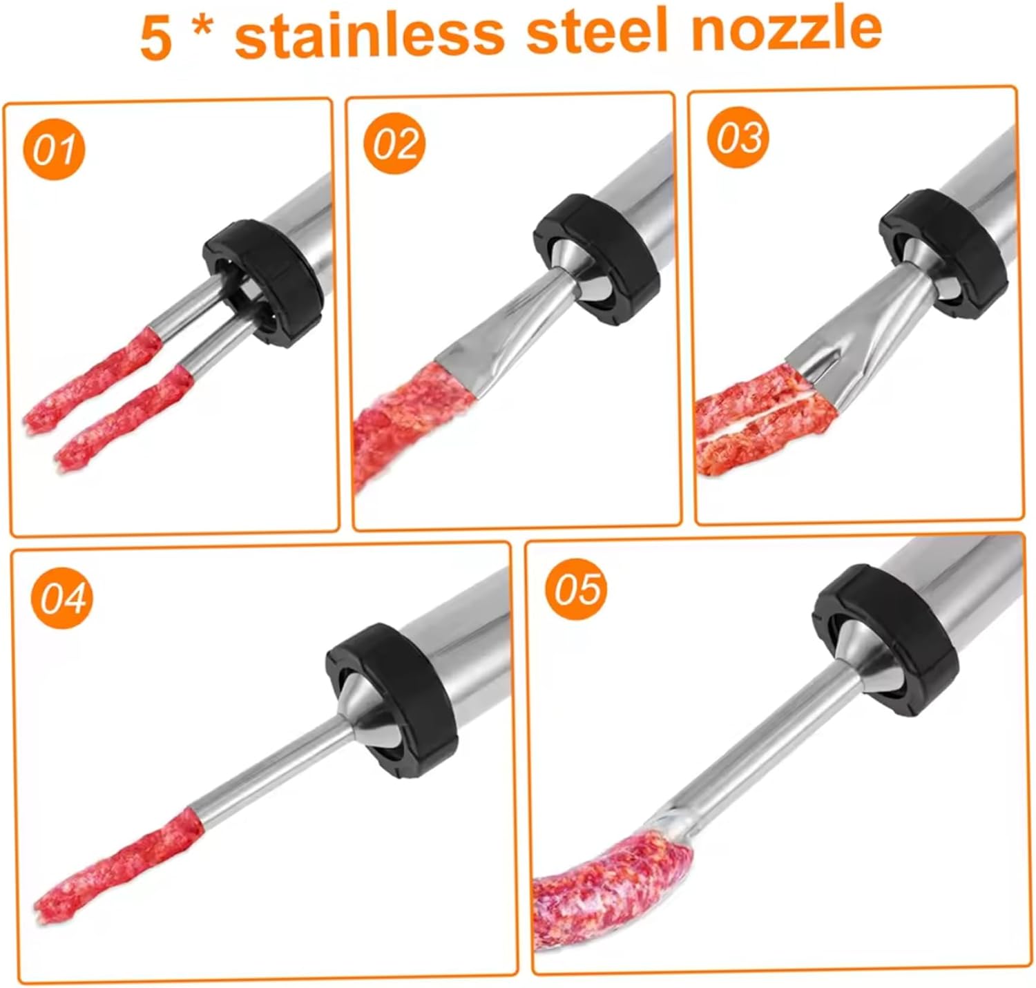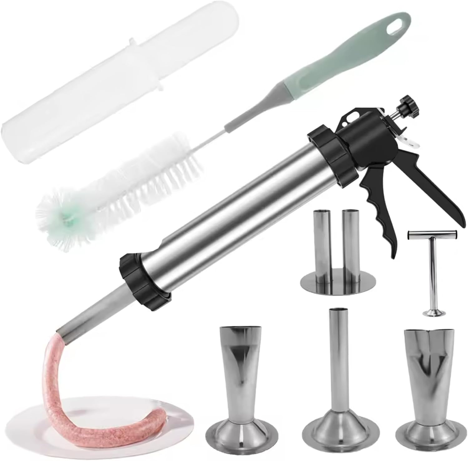 Description: This stainless steel jerky gun kit provides a rust-resistant tool designed for home cooks and meal preppers who want to create high-quality beef jerky, sausage, and other ground meat snacks with ease. Equipped with multiple nozzle sizes, it provides precise control over the shape and thickness of each piece, meeting diverse recipe needs. The ergonomic handle and smooth plunger reduce hand strain, making the stuffing process comfortable for extended use. Included cleaning brushes ensure all parts are thoroughly cleaned and maintained, promoting hygienic food preparation. By enabling consistent portion control and faster production, this jerky gun kit streamlines DIY meat processing, helping users while enjoying fresh, flavorful snacks made from their preferred ingredients. Perfectly suited for anyone looking to elevate their homemade jerky and meal prepping routine, this versatile meat gun combines convenience, durability, and functionality without compromising quality. Features:. Jerky Gun. -Color: Silver. -Material: Stainless Steel. Note:Manual measurement, please allow slight errors on size.The colors may exist slight difference due to different screens. Package Including 1 Set Jerky Gun