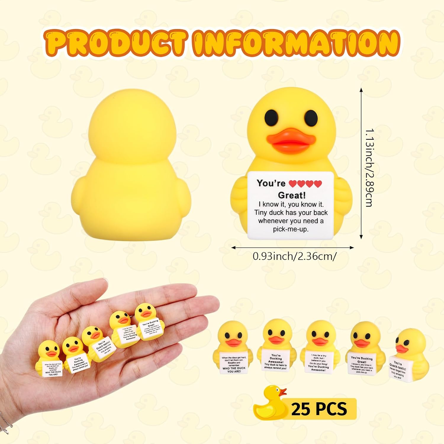 Features: Mini duck in bulk can be applied in educational activities, art projects, or as adorable decorative pieces for desks or shelves. Their versatility ensures they can meet a wide array of customer needs and preferences. The construction not only ensures durability but also makes cleaning a breeze. Simply rinse them under the water for quick cleaning after playtime or decoration use. Their maintenance-free nature means you can enjoy them hassle-free, providing endless joy without extra effort. Specifications: Material: PVC Color: yellow Size: about 1.1 inches/ 2.8 cm Package includes: 25 x Ducks set Notes: Manual measurement, please allow slight errors on size. The color may exist a slight difference due to different screen displays