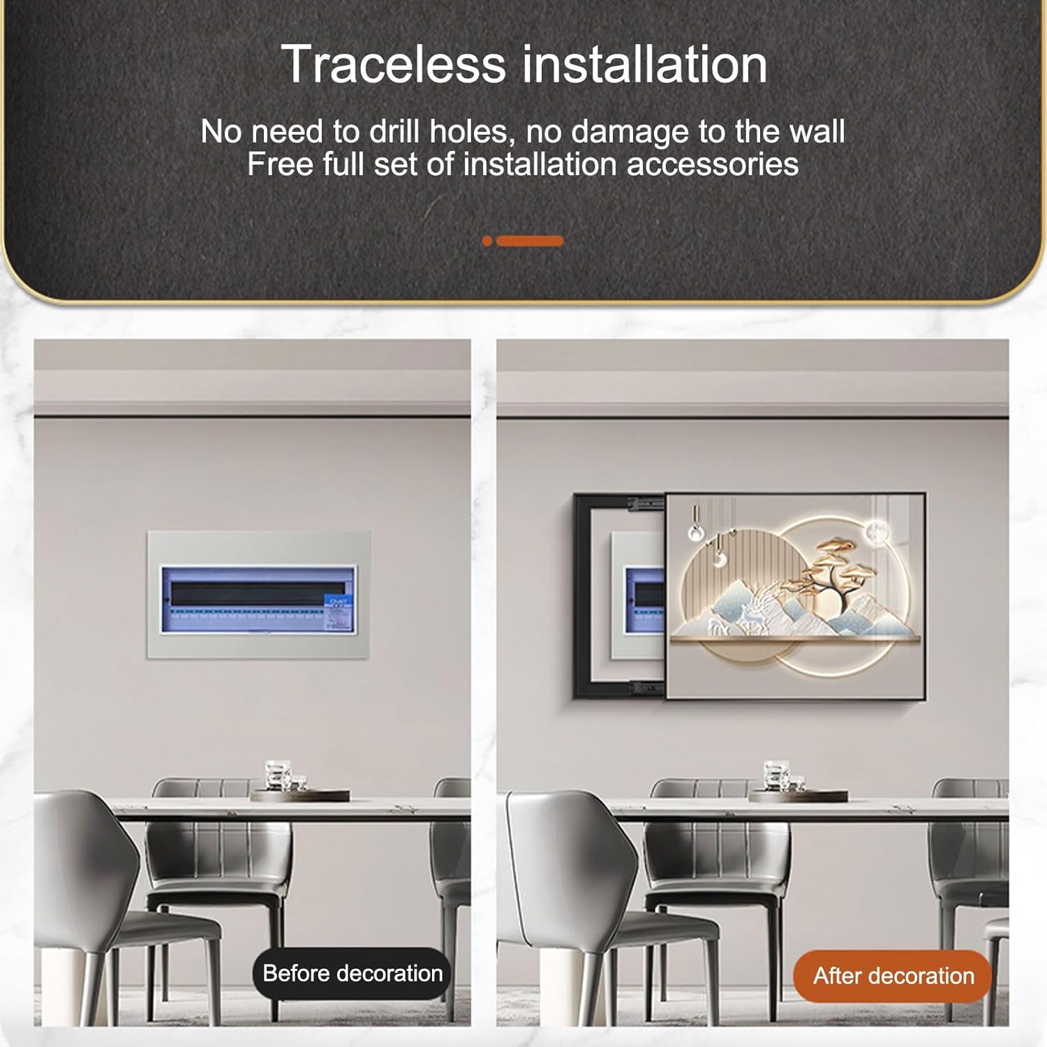 >> The crisp graphics on the fuse box cover add a touch of charm to this popular and practical product. Not only does the graphic cover the switchboard, it also enhances the visual appeal of the space.>> This decorative panel cover is easy to install, saving you the hassle and cost of hiring a professional. It is also designed to be easy to open and close, allowing you to easily access the fuse box.----[Product details]>> Hidden art makes home more cozyBe an artist in life and put on invisible cloak for the electric meter box>> Traceless installation without drilling and does not damage the wallGive away a full set of installation accessories>> The polymer frame is strong, durable and lightweightNot only has good hardness, but also weighs about 2/1 of traditional aluminum alloy>> Hydraulic rodStainless steel pressure rod, saves space, durable and does not break----[Product specifications]>> Product name: Multifunctional electric meter box>> Product style: Simple and modern>> Frame type: Top cover/left push-pull/right push-pull/hydraulic top cover>> Applicable objects: General>> Frame material: PS>> Mounting method: Framed>> Applicable space: Electric meter box>> Function: Decoration/Hide/Inspection/Hide ugliness>> Pattern: Scenery>> Packing type: Box