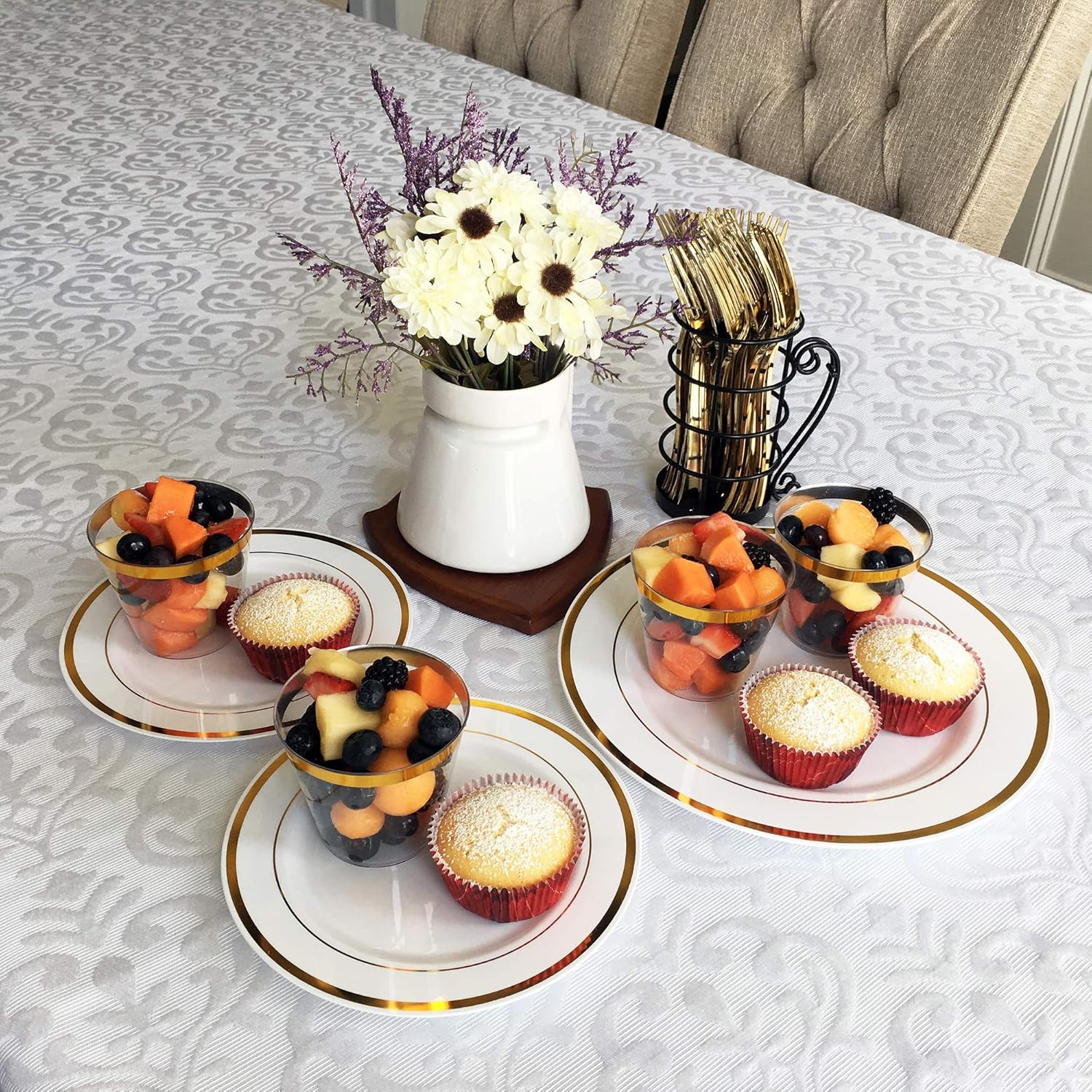 Enhance your events with the deluxe 125 Piece Gold Plastic Plates & Cutlery Set by JL Prime. Perfect for weddings, anniversaries, bridal showers, and parties, these elegant plates feature a sophisticated gold rim that mimics fine dinnerware. Impress your guests with the refined appearance of these high-quality plastic plates and cutlery, designed to add a touch of class to any celebration. This set includes 25 dinner plates, 25 salad plates, 25 forks, 25 knives, and 25 spoons, providing everything you need for a complete table setting. Each piece is full-size and sturdy, offering a comfortable dining experience without the hassle of real dinnerware. Say goodbye to flimsy plastic tableware that can ruin the dining experience. Our gold plastic plates and cutlery replicate the weight and appearance of expensive dinnerware, ensuring your guests appreciate the quality. Crafted from high-quality, BPA-free plastic, our plates and cutlery are safe, durable, and eco-friendly. They can be reused and recycled, helping to reduce waste and protect the environment. Note: Not microwave-safe and recommended for hand washing only. Upgrade your next event with the sophistication and convenience of our Gold Plastic Plates & Cutlery Set by JL Prime. Order now to impress your guests with an elegant dining experience.