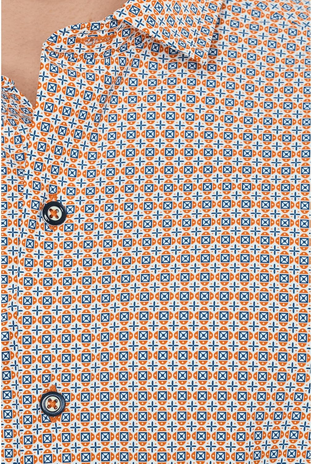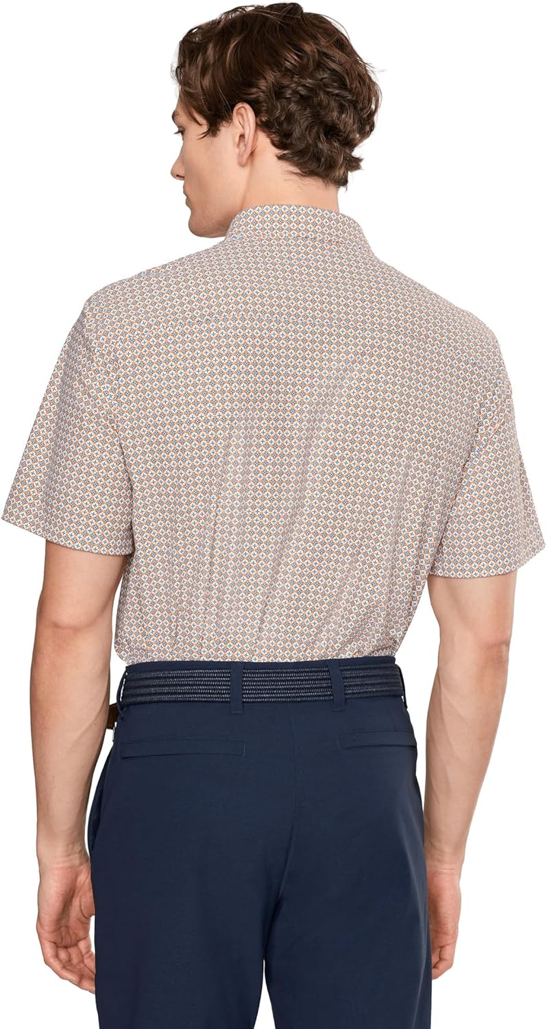 A short sleeve printed performance knit shirt ready for travel or long days on the go