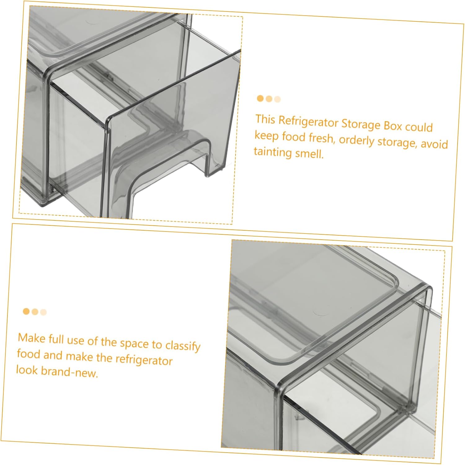 Package List 2 pcs x 1 × storage bin Characteristics -Material:PP fridge drawer - Size: 33.50X12.00X11.00cm/13.17X4.72X4.32in Fridge Bin with Pull-out Drawer -Color:Grey cheese container - Made of PP material, fashionable and unique, simple and reusable, with toughness and hardness, directly be used to storage your food vegetable organizer for fridge. - You can keep it in kitchens, countertops, pantry shelves, refrigerators, freezers, cabinets, closets, bedrooms, bathrooms vegetable containers for refrigerator. - Make full use of the space to classify food and make the refrigerator look brand-new refrigerator drawer replacement. - It stores yogurt, sliced cheese, snacks, fruit, vegetables, , meats, bacon and more fridge organizer drawer. - This Refrigerator Storage Box could keep food fresh, orderly storage, avoid tainting smell fridge storage containers.Goods Informationfruit and vegetable storage for refrigerator And this clear Fridge Drawer Organizer is convenient and practical to keep the refrigerator clean.fridge drawer You can keep the food clean and beautiful.refrigerator storage This Food Storage Box is made of PP material, durable and suitable for kitchen refrigerator